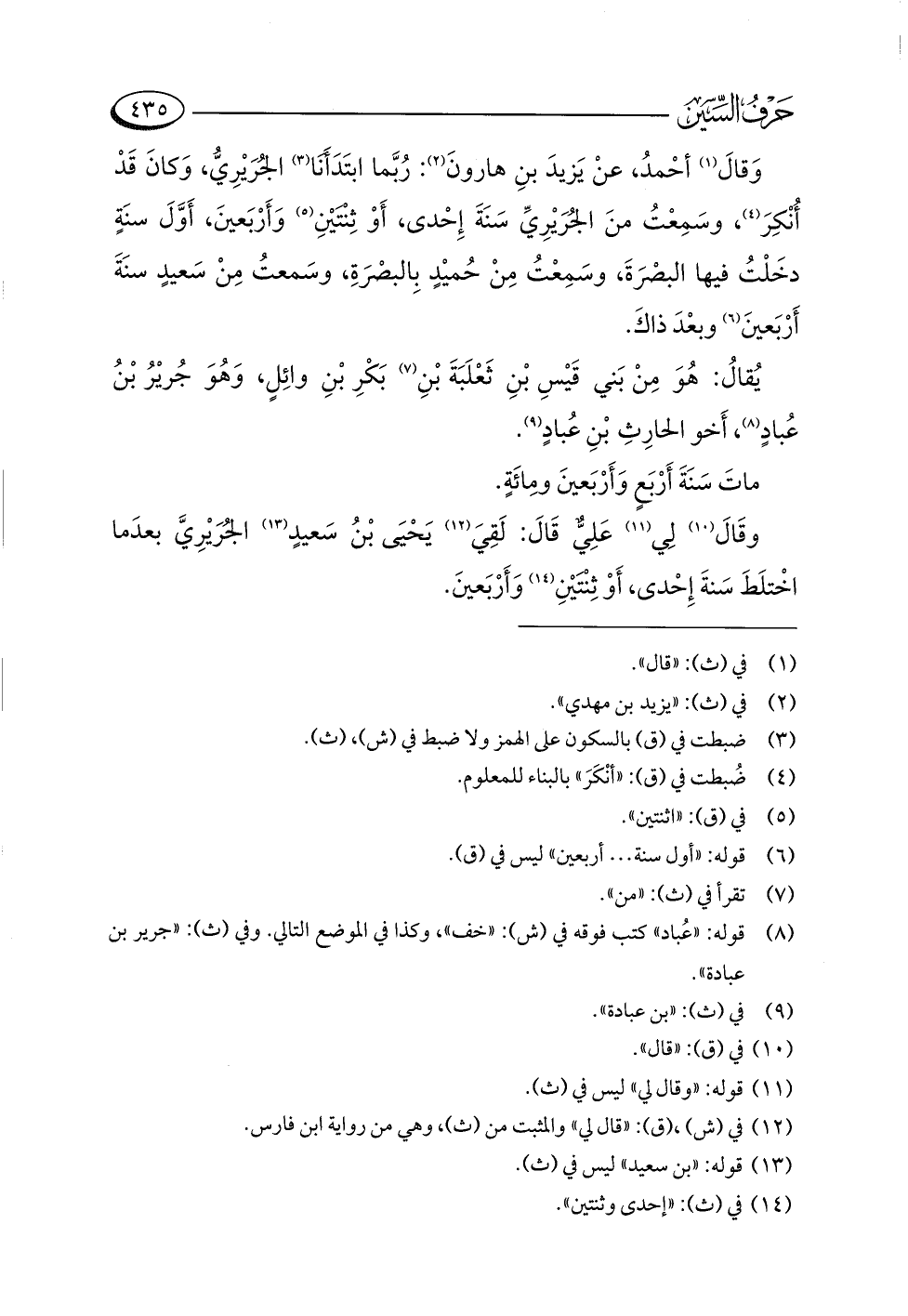 وقَالَ (¬١٠) لِي (¬١١) عَلِيٌّ قال: لَقِيَ (¬١٢) يحيى بْنُ سَعيدٍ (¬١٣) الجُرَيْرِيَّ بعدَما اخْتلَطَ سَنةَ إِحْدى، أَوْ ثِنْتَيْنِ (¬١٤) وَأَرْبَعينَ.
