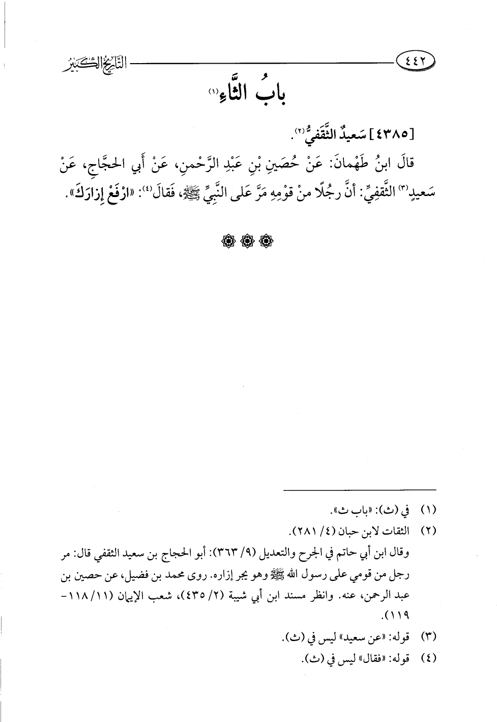 قالَ ابنُ طَهْمانَ: عَنْ حُصَينِ بْنِ عَبْدِ الرَّحْمنِ، عَنْ أَبي الحجَّاجِ، عَنْ سَعيدٍ (¬٣) الثَّقفِيِّ: أنَّ رجُلًا منْ قوْمِهِ مَرَّ عَلى النَّبِيِّ -صلى اللَّه عليه وسلم-، فَقالَ (¬٤): "ارْفَعْ إِزارَكَ".