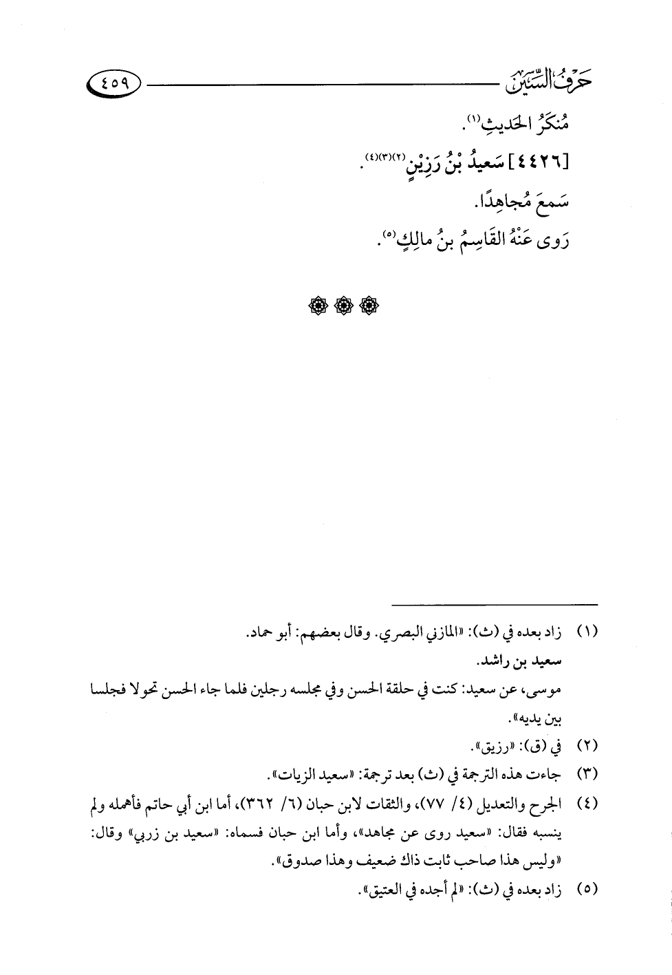 (¬٤) الجرح والتعديل (٤/ ٧٧)، والثقات لابن حبان (٦/ ٣٦٢)، أما ابن أبي حاتم فأهمله ولم ينسبه فقال: "سعيد روى عن مجاهد"، وأما ابن حبان فسماه: "سعيد بن زربي" وقال: "وليس هذا صاحب ثابت ذاك ضعيف وهذا صدوق".