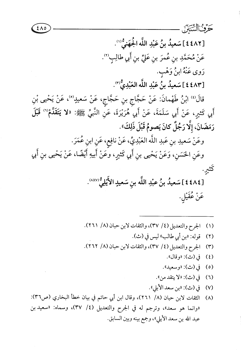 (¬٨) الثقات لابن حبان (٨/ ٢٦١)، وقال ابن أبي حاتم في بيان خطأ البخاري (ص ٣٦): "وإنما هو سعد"، وترجم له في الجرح والتعديل (٤/ ٣٧)، وسماه: "سعيد بن عبد اللَّه بن سعد الأيلي"، وجمع بينه وبين السابق.