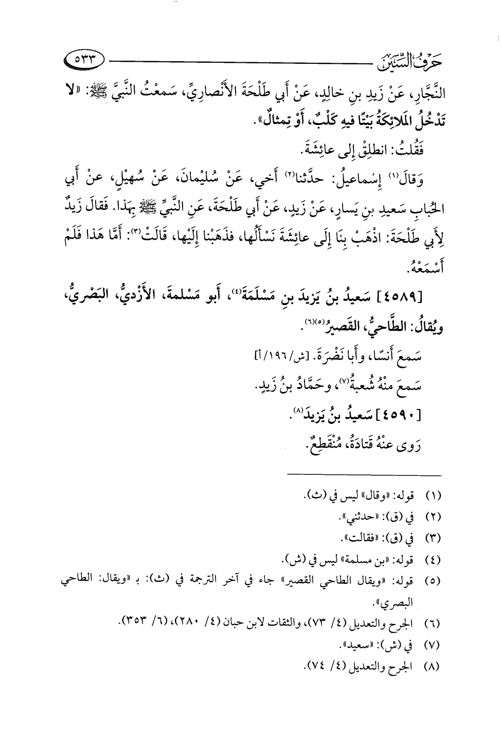 [٤٥٨٩] سَعيدُ بنُ يَزيدَ بنِ مَسْلَمَةَ (¬٤)، أَبو مَسْلمةَ، الأَزْديُّ، البَصْريُّ، ويُقالُ: الطَّاحيُّ، القَصيرُ (¬٥) (¬٦).