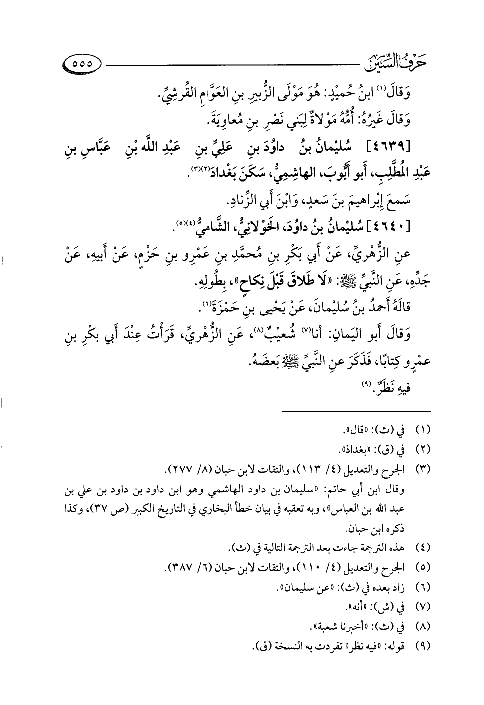 وقال ابن أبي حاتم: "سليمان بن داود الهاشمي وهو ابن داود بن داود بن علي بن عبد اللَّه بن العباس"، وبه تعقبه في بيان خطأ البخاري في التاريخ الكبير (ص ٣٧)، وكذا ذكره ابن حبان.
