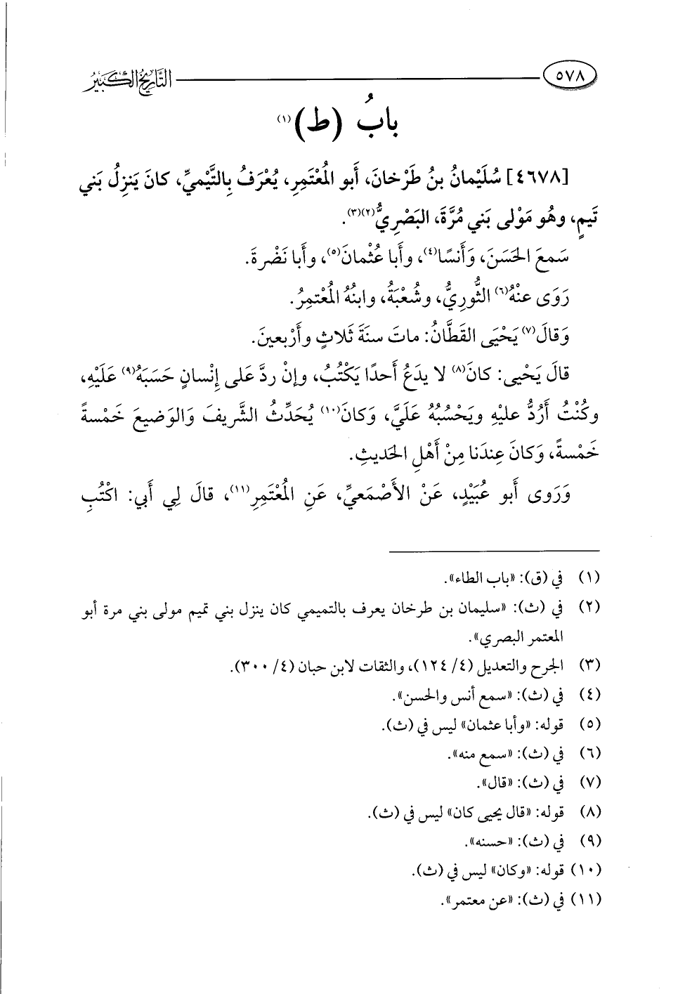 (¬٢) في (ث): "سليمان بن طرخان يعرف بالتميمي كان ينزل بني تميم مولى بني مرة أبو المعتمر البصري".