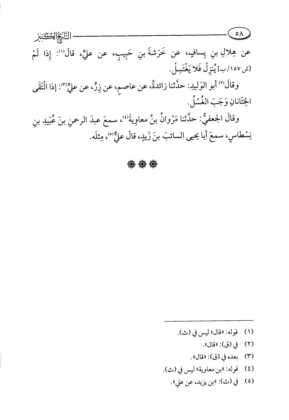 وقالَ الجعفيُّ: حدَّثنا مَرْوانُ بنُ معاوِيةَ (¬٤)، سمعَ عبدَ الرحمنِ بنَ عُبَيدِ بنِ نِسْطاسٍ، سمعَ أبا يحيى السائبَ بنَ زَيدٍ، قالَ عليٌّ (¬٥)، مِثلَه.