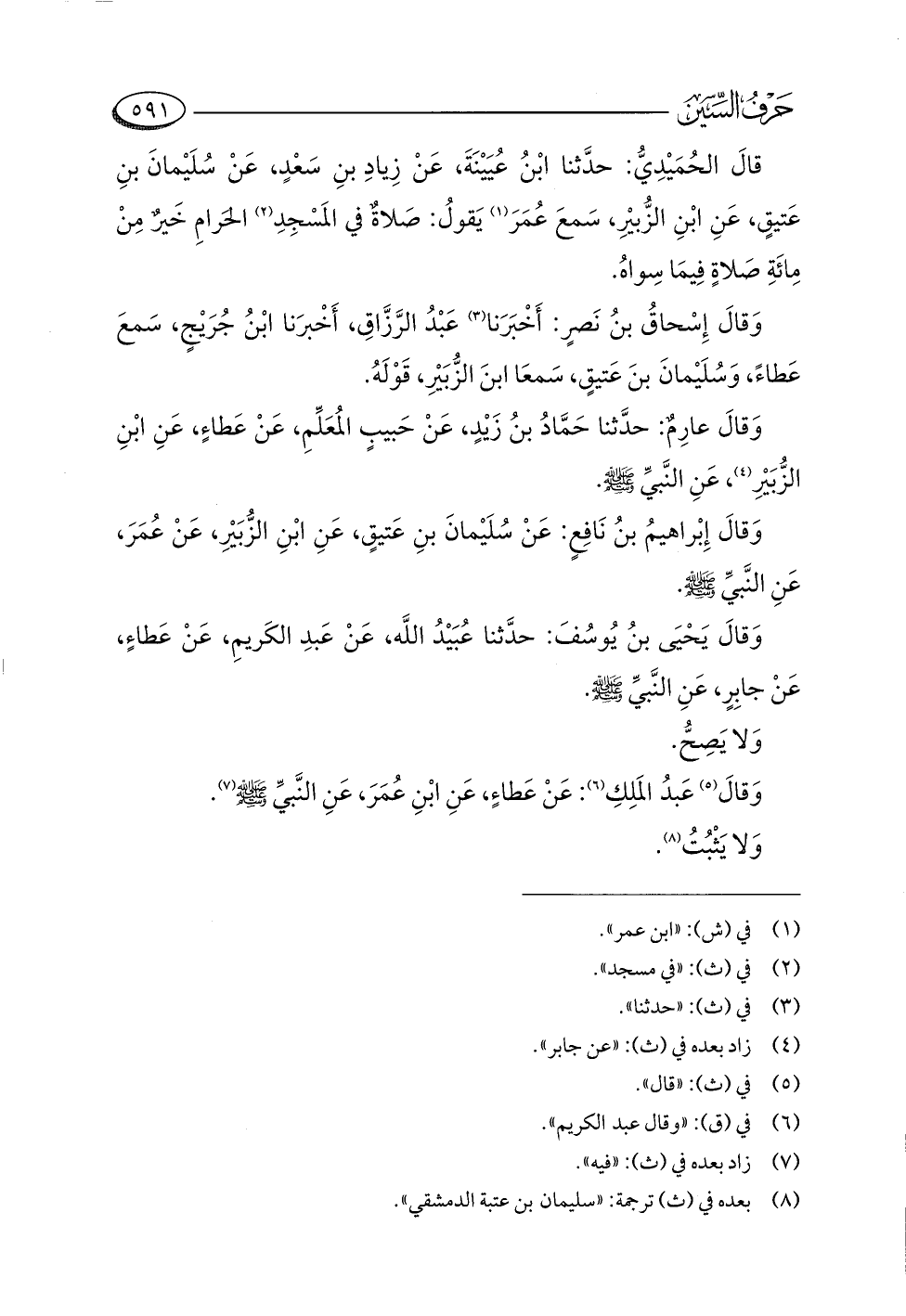 قالَ الحُمَيْدِيُّ: حدَّثنا ابْنُ عُيَيْنَةَ، عَنْ زِيادِ بنِ سَعْدٍ، عَنْ سُلَيْمانَ بنِ عَتيقٍ، عَنِ ابْنِ الزُّبيْرِ، سَمعَ عُمَرَ (¬١) يَقولُ: صَلاةٌ في المَسْجِدِ (¬٢) الحَرامِ خَيرٌ مِنْ مِائَةِ صَلاةٍ فيمَا سِواهُ.