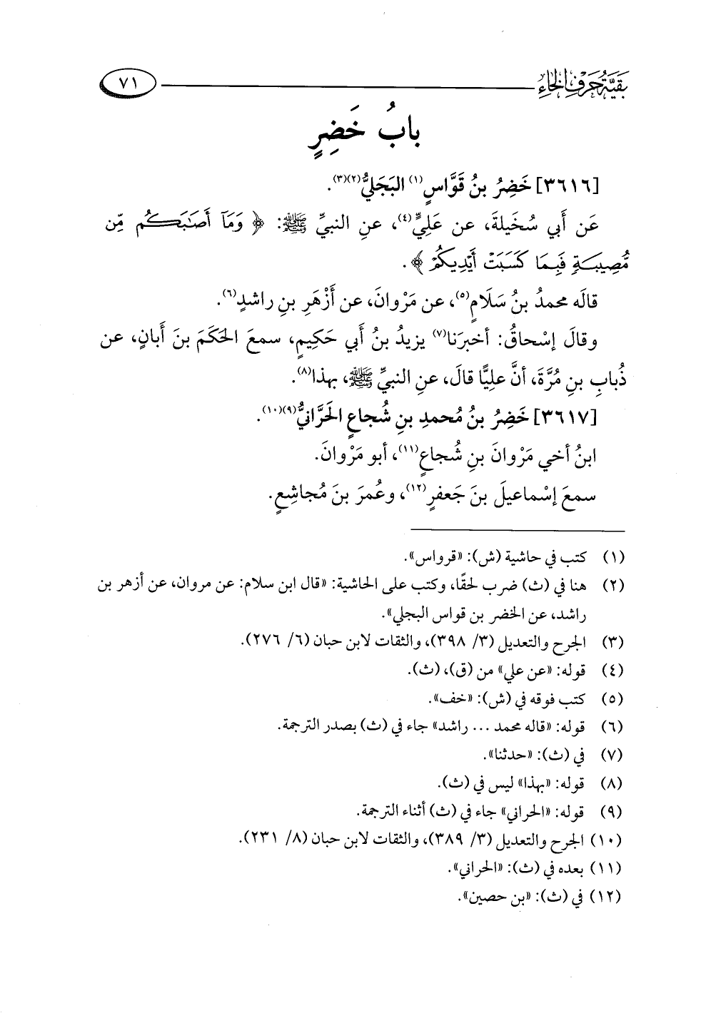 (¬٢) هنا في (ث) ضرب لحقًا، وكتب على الحاشية: "قال ابن سلام: عن مروان، عن أزهر بن راشد، عن الخضر بن قواس البجلي".