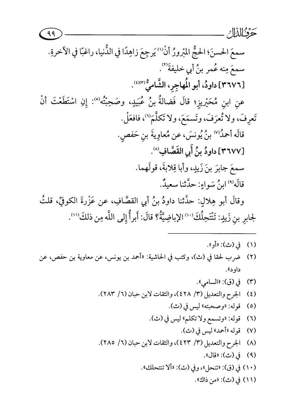 وقالَ أبو هِلالٍ: حدَّثنا داودُ بنُ أبي القصَّافِ، عن عَزْرةَ الكوفيِّ، قلتُ لجابرِ بنِ زَيدٍ: تَنْتَحِلُكَ (¬١٠) الإباضِيَّةُ؟ قالَ: أَبرأُ إِلى اللَّه مِن ذلكَ (¬١١).