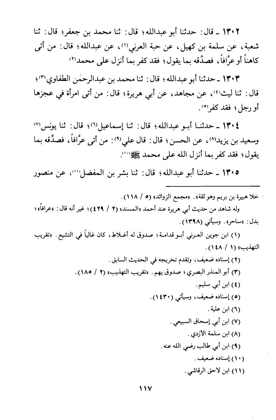 1302 - قَالَ: حَدَّثَنَا أَبُو عَبْدِ اللَّهِ، قَالَ: ثنا مُحَمَّدُ بْنُ جَعْفَرٍ، قَالَ: ثنا شُعْبَةُ، عَنْ سَلَمَةَ بْنِ كُهَيْلٍ، عَنْ حَبَّةَ الْعُرَنِيِّ، عَنْ عَبْدِ اللَّهِ، قَالَ: «§مَنْ أَتَى كَاهِنًا أَوْ عَرَّافًا، فَصَدَّقَهُ بِمَا يَقُولُ، فَقَدْ كَفَرَ بِمَا أُنْزِلَ عَلَى مُحَمَّدٍ»