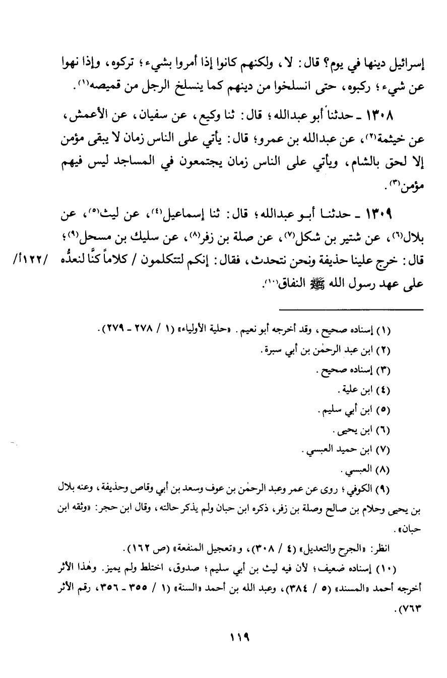 1309 - حَدَّثَنَا أَبُو عَبْدِ اللَّهِ، قَالَ: ثنا إِسْمَاعِيلُ، عَنْ لَيْثٍ، عَنْ بِلَالٍ، عَنْ شُتَيْرِ بْنِ شَكَلٍ، عَنْ صِلَةَ بْنِ زُفَرَ، عَنْ سُلَيْكِ بْنِ مِسْحَلٍ، قَالَ: خَرَجَ عَلَيْنَا حُذَيْفَةُ وَنَحْنُ نَتَحَدَّثُ، فَقَالَ: «§إِنَّكُمْ لَتَتَكَلَّمُونَ كَلَامًا كُنَّا لَنَعُدُّهُ عَلَى عَهْدِ رَسُولِ اللَّهِ صَلَّى اللهُ عَلَيْهِ وَسَلَّمَ النِّفَاقَ»
