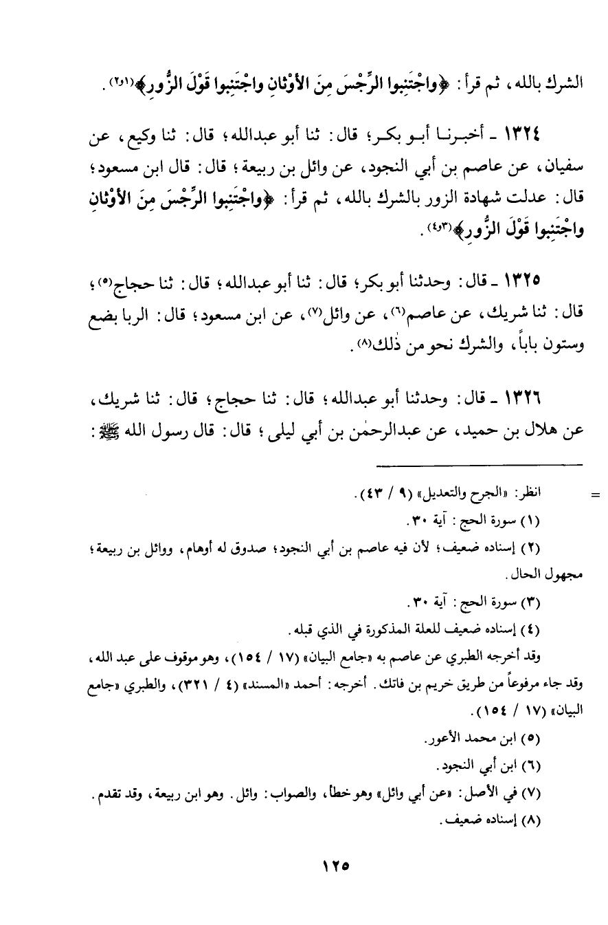 1324 - أَخْبَرَنَا أَبُو بَكْرٍ، قَالَ: ثنا أَبُو عَبْدِ اللَّهِ، قَالَ: ثنا وَكِيعٌ، عَنْ سُفْيَانَ، عَنْ عَاصِمِ بْنِ أَبِي النَّجُودِ، عَنْ وَائِلِ بْنِ رَبِيعَةَ، قَالَ: قَالَ ابْنُ مَسْعُودٍ، قَالَ: «§عُدِلَتْ شَهَادَةُ الزُّورِ بِالشِّرْكِ بِاللَّهِ» ، ثُمَّ قَرَأَ: {فَاجْتَنِبُوا الرِّجْسَ مِنَ الْأَوْثَانِ وَاجْتَنِبُوا قَوْلَ الزُّورِ} [الحج: 30]