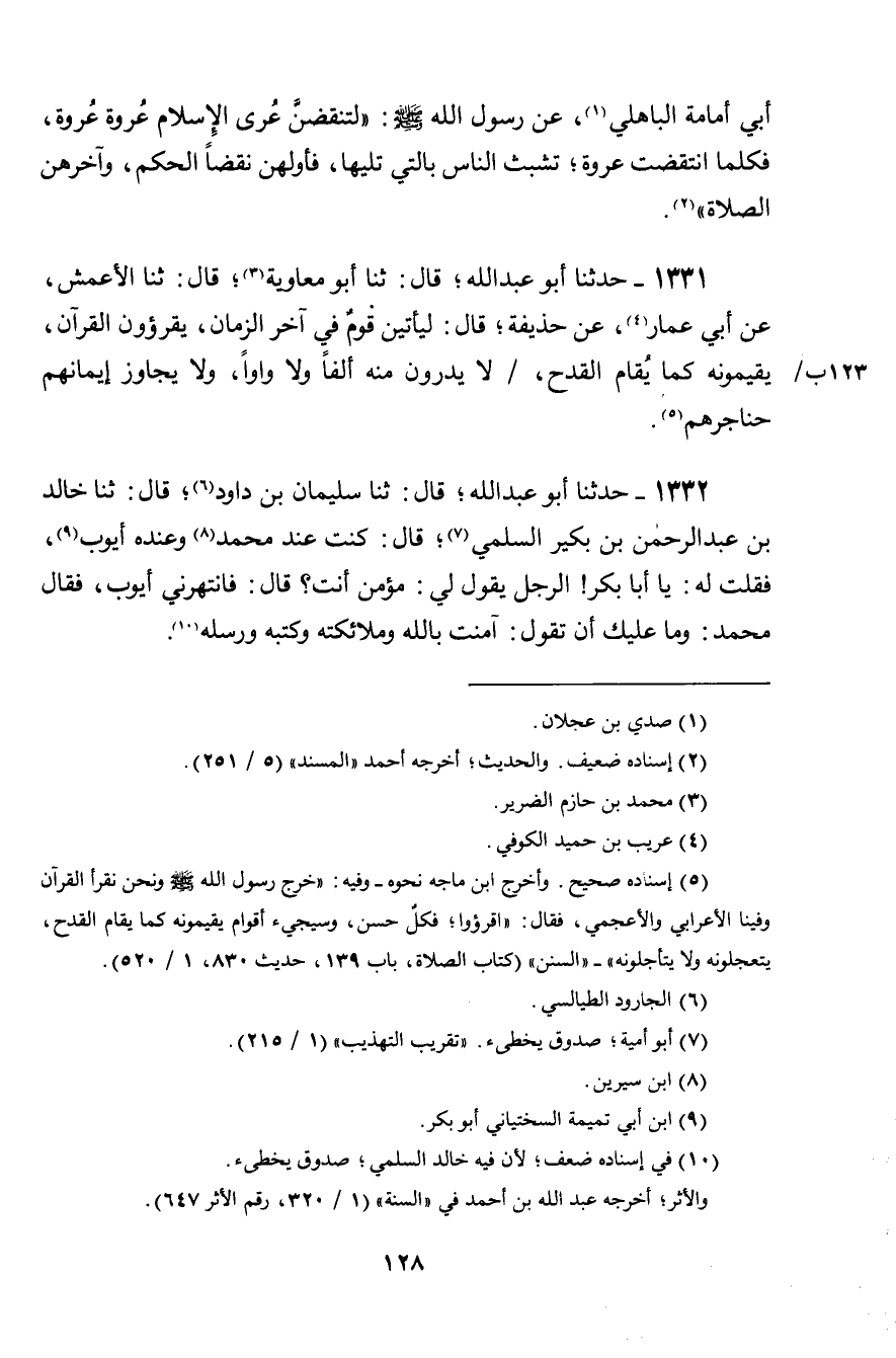 1331 - حَدَّثَنَا أَبُو عَبْدِ اللَّهِ، قَالَ: ثنا أَبُو مُعَاوِيَةَ، قَالَ: ثنا الْأَعْمَشُ، عَنْ أَبِي عَمَّارٍ، عَنْ حُذَيْفَةَ، قَالَ: «§لَيَأْتِيَنَّ قَوْمٌ فِي آخِرِ الزَّمَانِ، يَقْرَءُونَ الْقُرْآنَ، يُقِيمُونَهُ كَمَا يُقَامُ الْقَدَحُ، لَا يَدْرُونَ مِنْهُ أَلِفًا وَلَا وَاوًا، وَلَا يُجَاوِزُ إِيمَانُهُمْ حَنَاجِرَهُمْ»