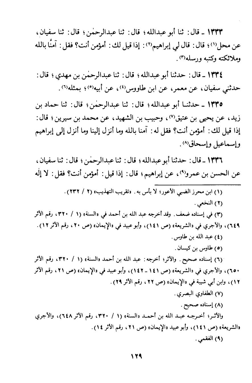 1333 - قَالَ: ثنا أَبُو عَبْدِ اللَّهِ، قَالَ: ثنا عَبْدُ الرَّحْمَنِ، قَالَ سُفْيَانُ، عَنْ مُحِلٍّ: قَالَ لِي إِبْرَاهِيمُ: " §إِذَا قِيلَ لَكَ: أَمُؤْمِنٌ أَنْتَ؟ فَقُلْ: آمَنَّا بِاللَّهِ، وَمَلَائِكَتِهِ، وَكُتُبِهِ، وَرُسُلِهِ ".