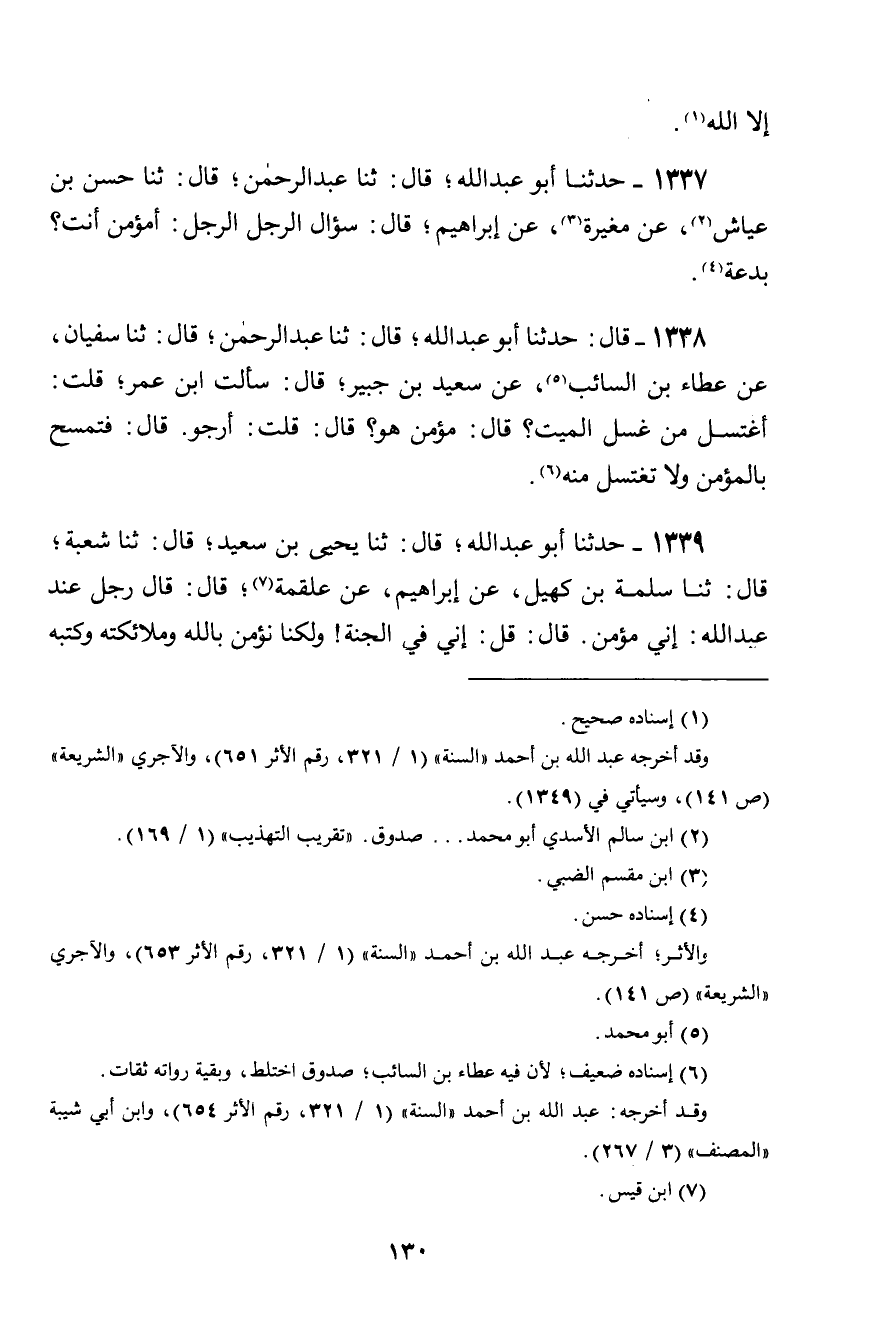 1337 - حَدَّثَنَا أَبُو عَبْدِ اللَّهِ، قَالَ: ثنا عَبْدُ الرَّحْمَنِ، قَالَ: ثنا حَسَنُ بْنُ عَيَّاشٍ، عَنْ مُغِيرَةَ، عَنْ إِبْرَاهِيمَ، قَالَ: " §سُؤَالُ الرَّجُلِ الرَّجُلَ: أَمُؤْمِنٌ أَنْتَ؟ بِدْعَةٌ "