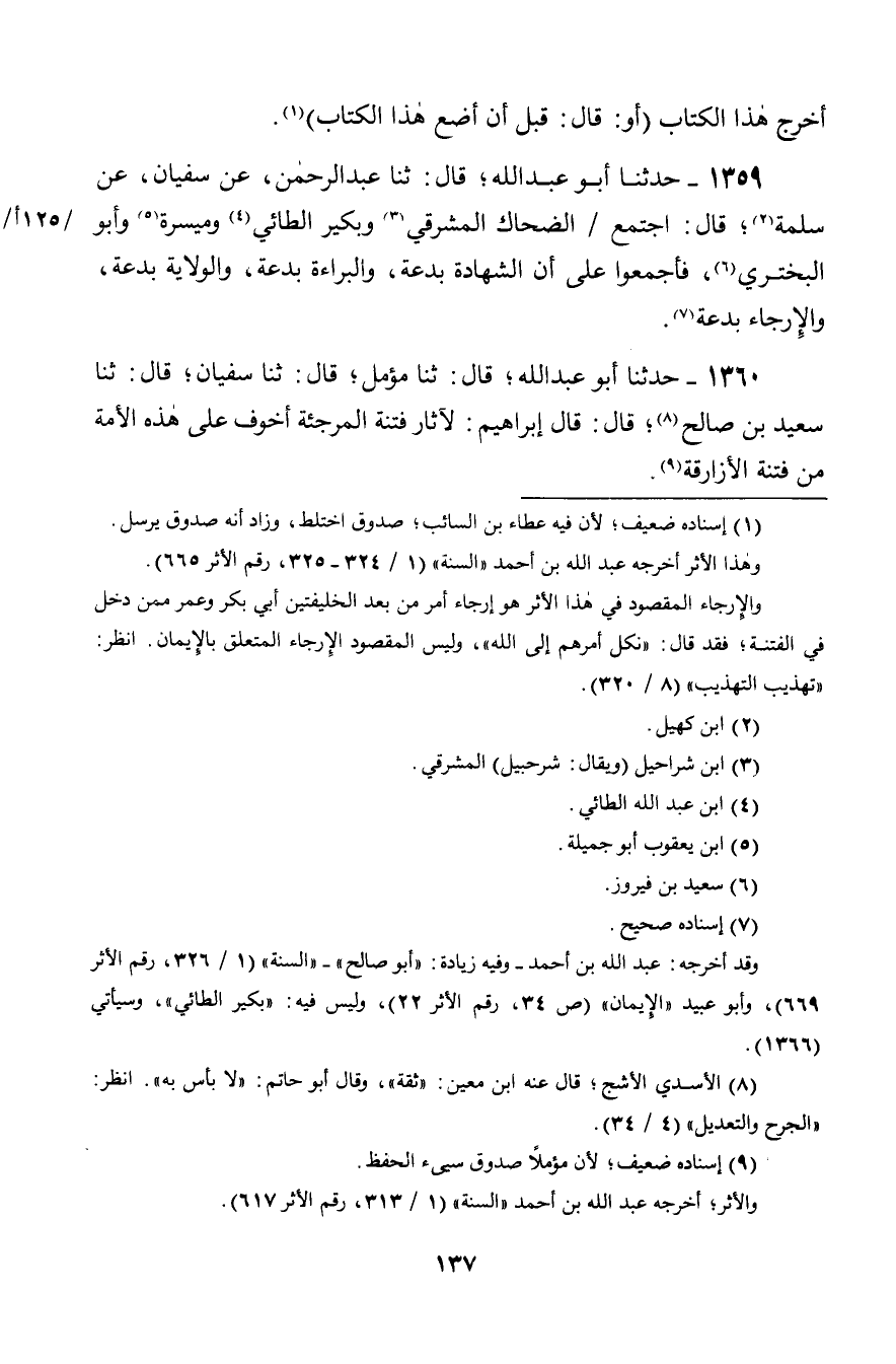 1359 - حَدَّثَنَا أَبُو عَبْدِ اللَّهِ، قَالَ: ثنا عَبْدُ الرَّحْمَنِ، عَنْ سُفْيَانَ، عَنْ سَلَمَةَ، قَالَ: «اجْتَمَعَ الضَّحَّاكُ الْمِشْرَقِيُّ، وَبُكَيْرٌ الطَّائِيُّ، وَمَيْسَرَةُ، وَأَبُو الْبَخْتَرِيِّ، فَأَجْمَعُوا عَلَى أَنَّ §الشَّهَادَةَ بِدْعَةٌ، وَالْبَرَاءَةَ بِدْعَةٌ، وَالْوَلَايَةَ بِدْعَةٌ، وَالْإِرْجَاءَ بِدْعَةٌ»