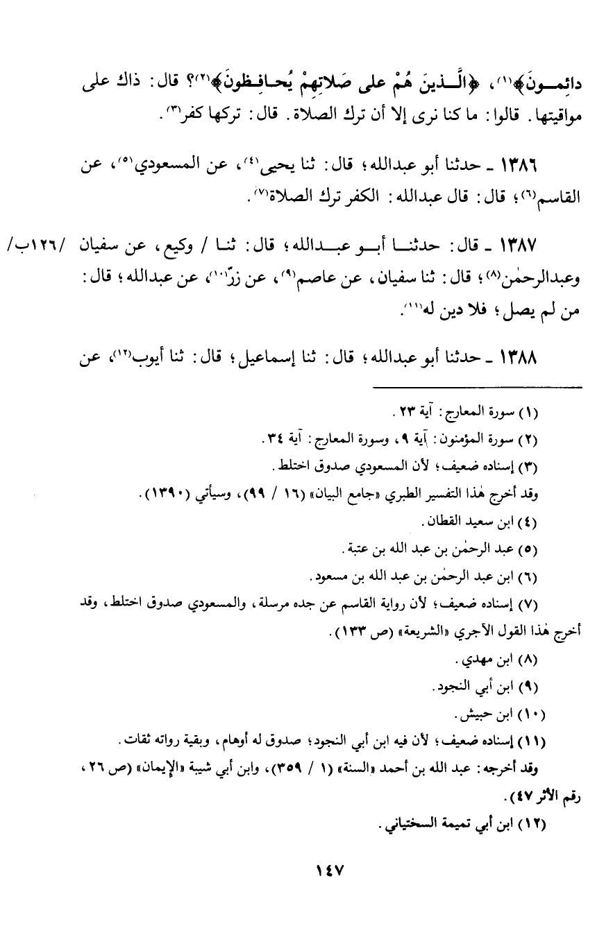 1386 - حَدَّثَنَا أَبُو عَبْدِ اللَّهِ، قَالَ: ثنا يَحْيَى، عَنِ الْمَسْعُودِيِّ، عَنِ الْقَاسِمِ، قَالَ: قَالَ عَبْدُ اللَّهِ: «§الْكُفْرُ تَرْكُ الصَّلَاةِ»