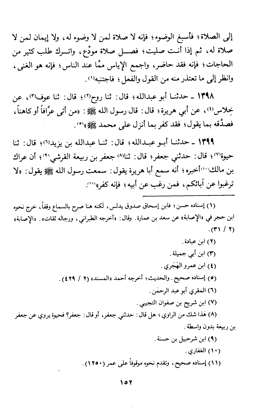 1399 - حَدَّثَنَا أَبُو عَبْدِ اللَّهِ، قَالَ: ثنا عَبْدُ اللَّهِ بْنُ يَزِيدَ، قَالَ: ثنا حَيْوَةُ، قَالَ: حَدَّثَنِي جَعْفَرٌ، قَالَ: ثنا جَعْفَرُ بْنُ رَبِيعَةَ الْقُرَشِيُّ، أَنَّ عِرَاكَ بْنَ مَالِكٍ أَخْبَرَهُ، أَنَّهُ سَمِعَ أَبَا هُرَيْرَةَ، يَقُولُ: سَمِعْتُ رَسُولَ اللَّهِ صَلَّى اللهُ عَلَيْهِ وَسَلَّمَ يَقُولُ: «§لَا تَرْغَبُوا عَنْ آبَائِكُمْ، فَمَنْ رَغِبَ عَنْ أَبِيهِ فَإِنَّهُ كَفَرَ»