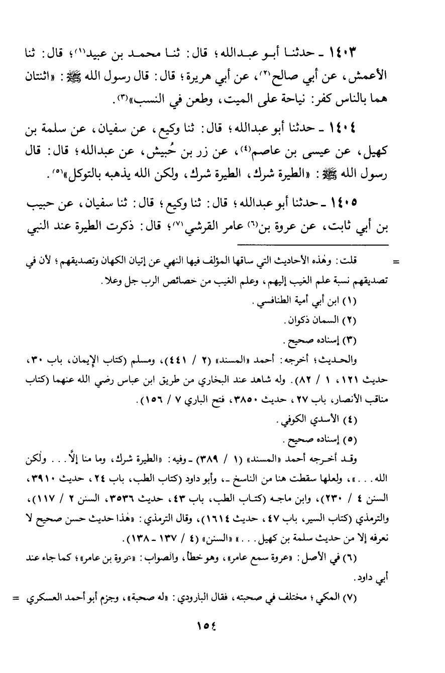 1404 - حَدَّثَنَا أَبُو عَبْدِ اللَّهِ، قَالَ: ثنا وَكِيعٌ، عَنْ سُفْيَانَ، عَنْ سَلَمَةَ بْنِ كُهَيْلٍ، عَنْ عِيسَى بْنِ عَاصِمٍ، عَنْ زِرِّ بْنِ حُبَيْشٍ، عَنْ عَبْدِ اللَّهِ، قَالَ: قَالَ رَسُولُ اللَّهِ صَلَّى اللهُ عَلَيْهِ وَسَلَّمَ: «§الطِّيَرَةُ شِرْكٌ، الطِّيَرَةُ شِرْكٌ، وَلَكِنَّ اللَّهَ يُذْهِبُهُ بِالتَّوَكُّلِ»
