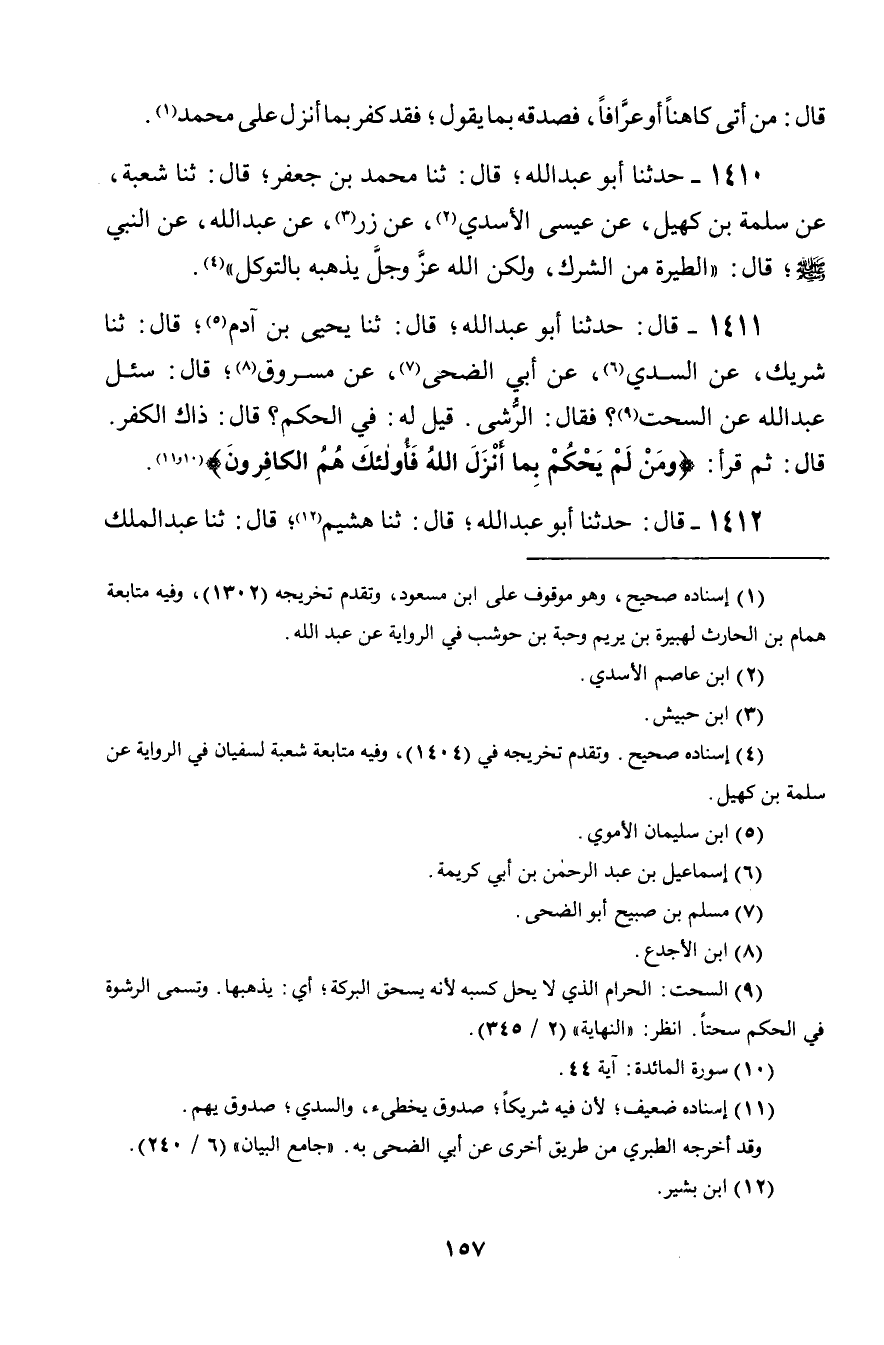 1412 - قَالَ: حَدَّثَنَا أَبُو عَبْدِ اللَّهِ، قَالَ: ثنا هُشَيْمٌ، قَالَ: ثنا عَبْدُ الْمَلِكِ -[158]- بْنُ أَبِي سُلَيْمَانَ، عَنْ سَلَمَةَ بْنِ كُهَيْلٍ، عَنْ عَلْقَمَةَ، وَالْأَسْوَدِ، أَنَّهُمَا سَأَلَا ابْنَ مَسْعُودٍ عَنِ الرِّشْوَةِ، فَقَالَ: " §هِيَ السُّحْتُ. قَالَا: أَفِي الْحُكْمِ ذَلِكَ؟ قَالَ: ذَلِكَ الْكُفْرُ. ثُمَّ تَلَا هَذِهِ الْآيَةَ: {وَمَنْ لَمْ يَحْكُمْ بِمَا أَنْزَلَ اللَّهُ فَأُولَئِكَ هُمُ الْكَافِرُونَ} [المائدة: 44] "