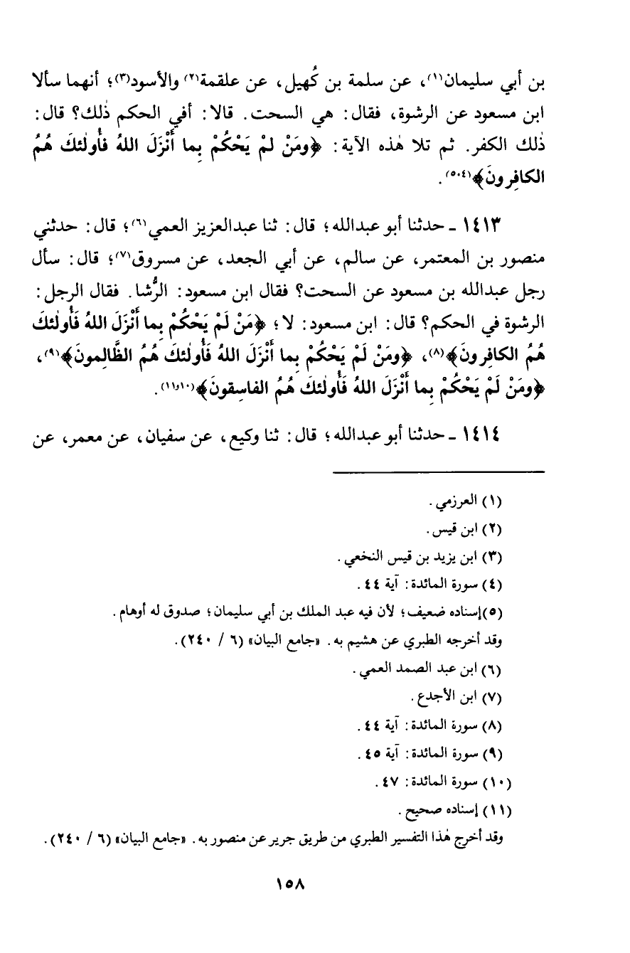 1413 - حَدَّثَنَا أَبُو عَبْدِ اللَّهِ، قَالَ: ثنا عَبْدُ الْعَزِيزِ الْعَمِّيُّ، قَالَ: حَدَّثَنِي مَنْصُورُ بْنُ الْمُعْتَمِرِ، عَنْ سَالِمٍ، عَنْ أَبِي الْجَعْدِ، عَنْ مَسْرُوقٍ، قَالَ: سَأَلَ رَجُلٌ عَبْدَ اللَّهِ بْنَ مَسْعُودٍ عَنِ السُّحْتِ،؟ فَقَالَ ابْنُ مَسْعُودٍ: " الرِّشَا، فَقَالَ الرَّجُلُ: §الرِّشْوَةُ فِي الْحُكْمِ؟ قَالَ ابْنُ مَسْعُودٍ: لَا، {وَمَنْ لَمْ يَحْكُمْ بِمَا أَنْزَلَ اللَّهُ فَأُولَئِكَ هُمُ الْكَافِرُونَ} [المائدة: 44] ، {وَمَنْ لَمْ يَحْكُمْ بِمَا أَنْزَلَ اللَّهُ فَأُوَلِئَكَ هُمُ الظَّالِمُونَ} [المائدة: 45] ، {وَمَنْ لَمْ يَحْكُمْ بِمَا أَنْزَلَ اللَّهُ فَأُولَئِكَ هُمُ الْفَاسِقُونَ} [المائدة: 47] "