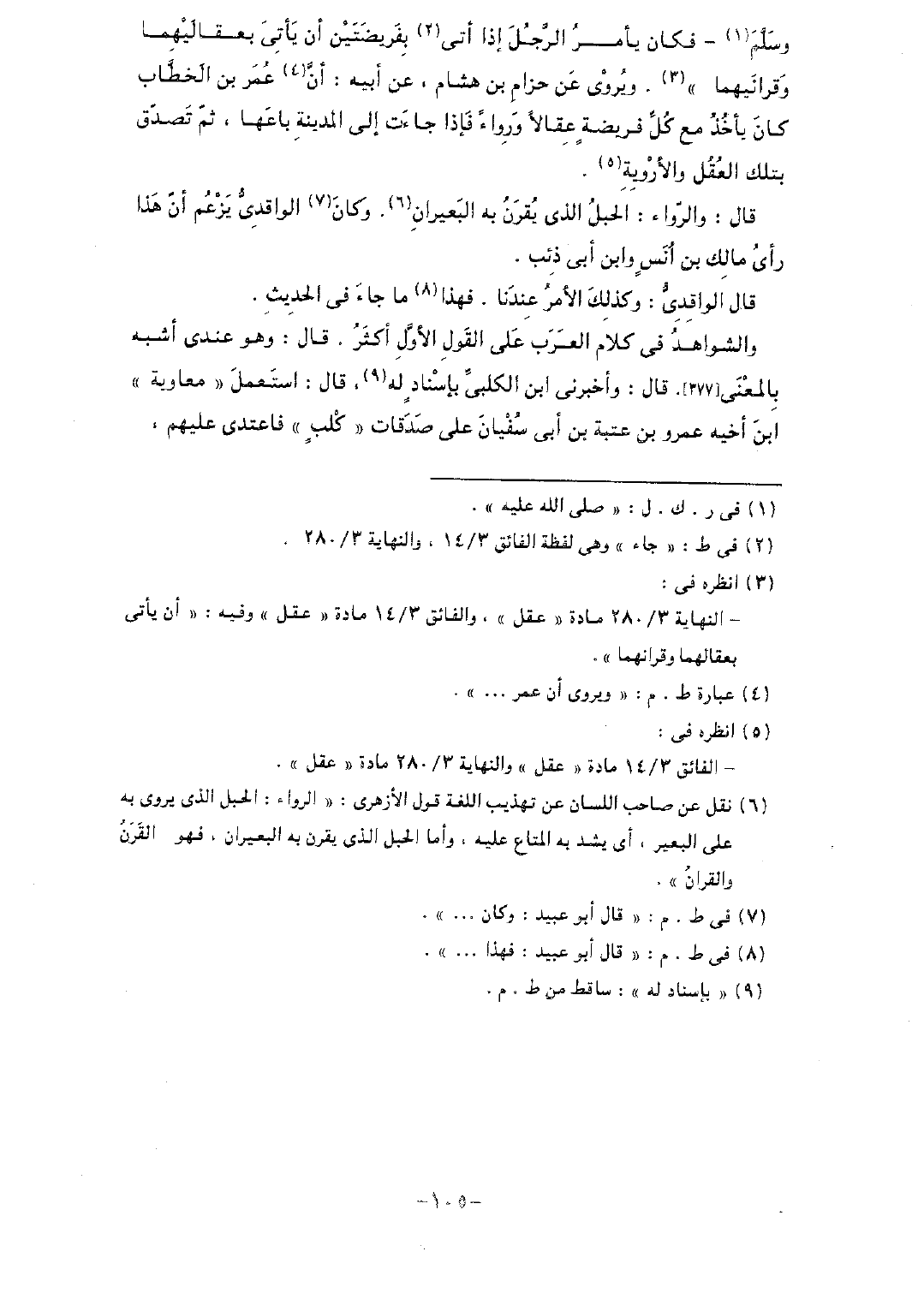 وسلم- فكان يأمر الرجل إذا أتى بفريضتين أن يأتي بعقاليهما وقرانيهما". ويُروى عن حزام بن هشام، عن أبيه: أن عمر بن الخطاب كان يأخذ مع كل فريضةٍ عقالاً ورواءً فإذا جاءت إلى المدينة باعها، ثم تصدق بتلك العُقل والأروية.