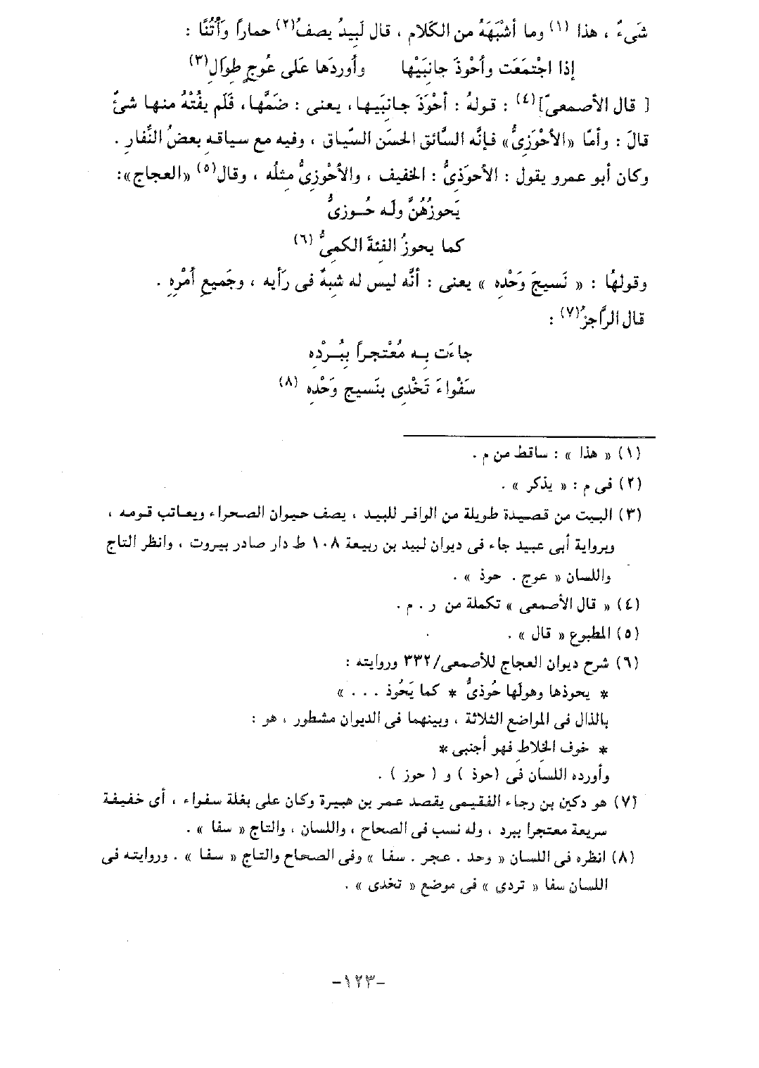 [قال الأصمعي]: قوله: أحوذ جانبيها، يعني: ضمها، فلم يفته منها شيء قال: وأما "الأحوزي" فإنه السائق الحسن السياق، وفيه مع سياقه بعض النفار. وكان أبو عمرو يقول: الأحوذي: الخفيف، والأحوزي مثله، وقال "العجاج":