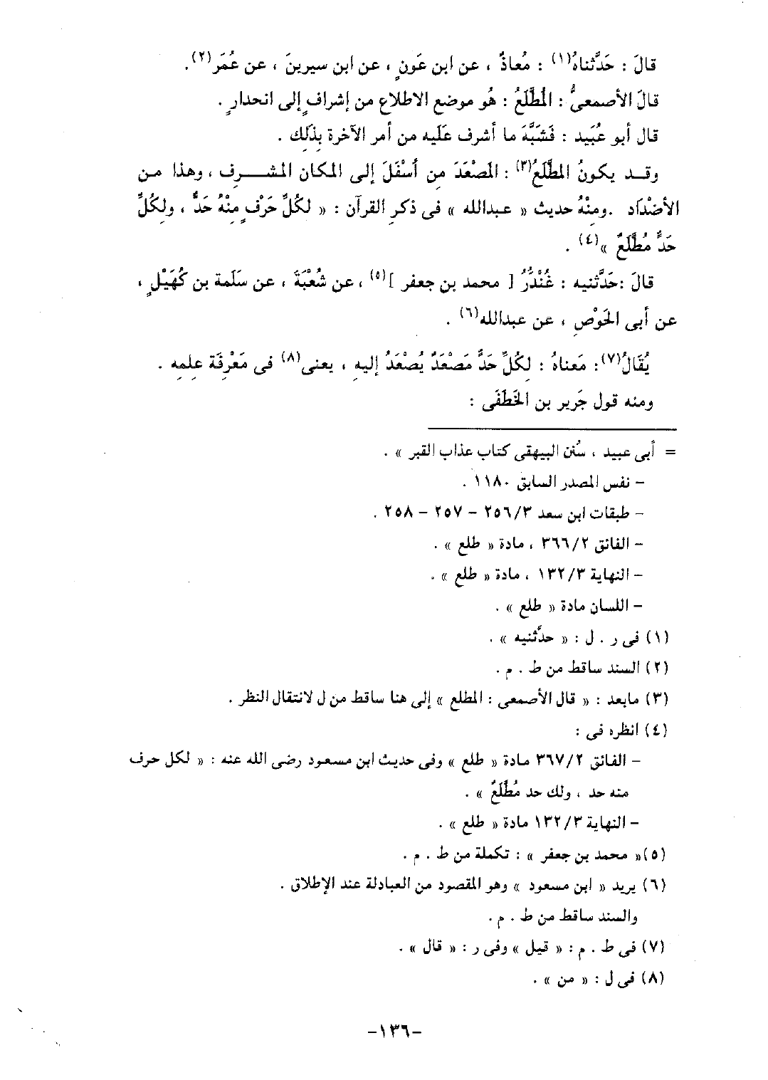 وقال يكون المطلع: المصعد من أسفل إلى المكان المشرف، وهذا من الأضداد. ومنه حديث "عبد الله" في ذكر القرآن: "لكل حرفٍ منه حد، ولكل حد مطلع".
