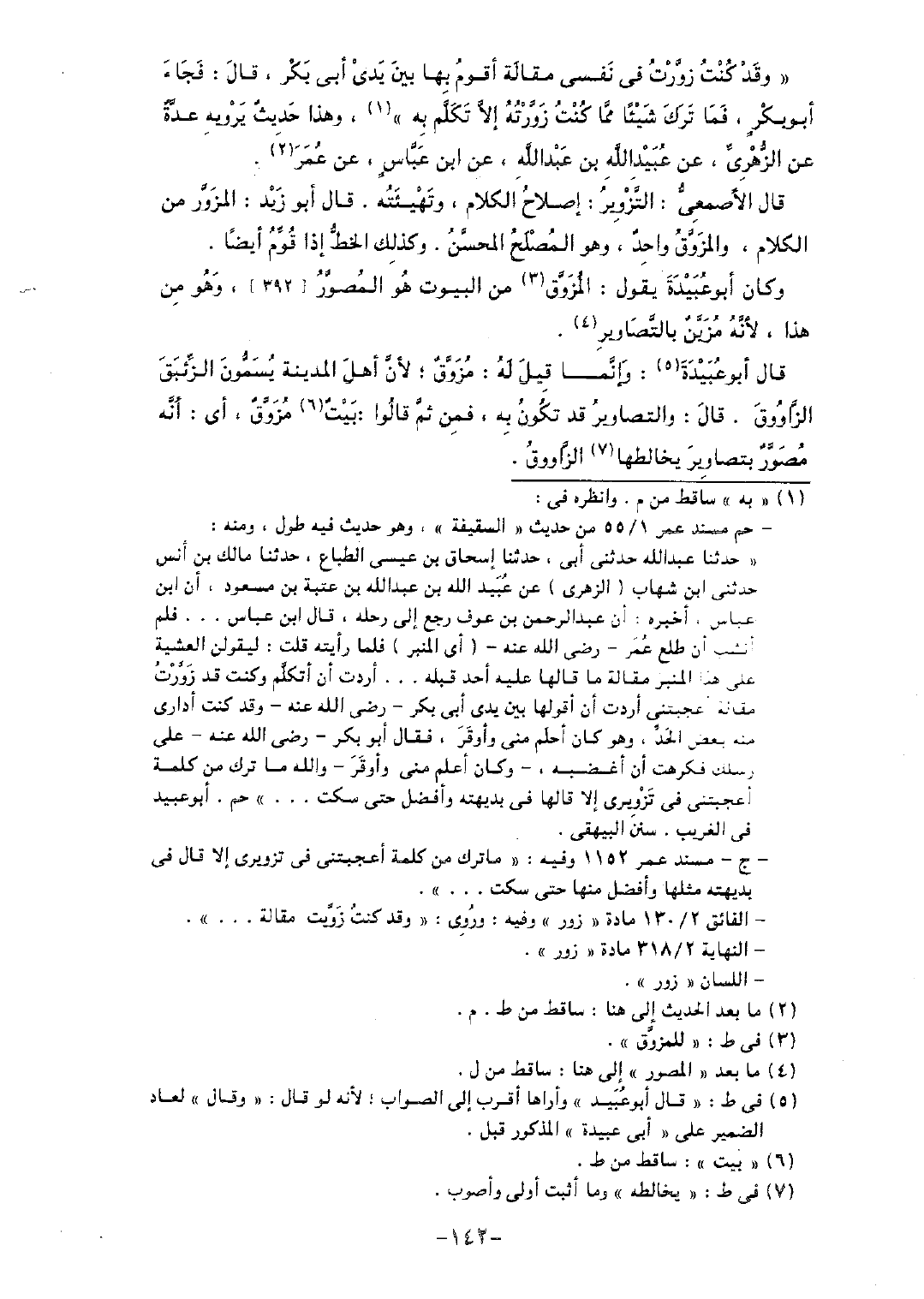 "وقد كنت زورت في نفسي مقالة أقوم بها بين يدي أبي بكر، قال: فجاء أبو بكرٍ، فما ترك شيئاً مما كنت زورته إلا تكلم به"، وهذا حديثٌ يرويه عدة عن الزهري، عن عبيد الله بن عبد الله: عن ابن عباسٍ: عن عمر.