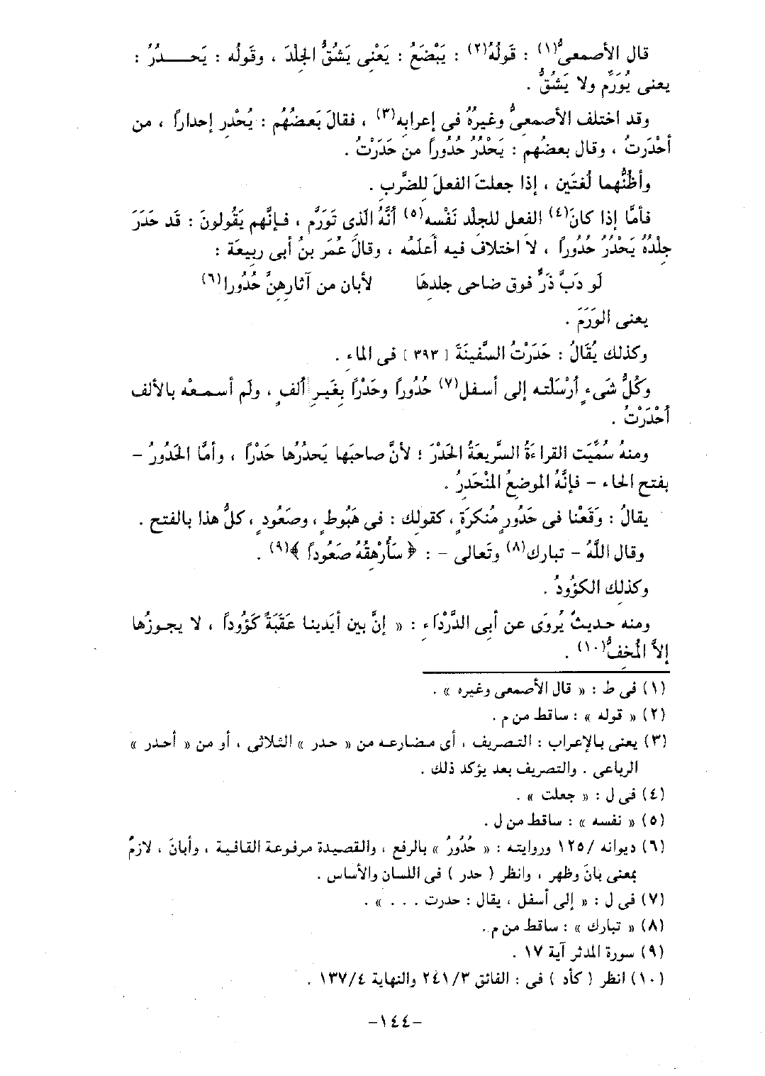 فأما إذا كان الفعل للجلد نفسه أنه الذي تورم، فإنهم يقولون: قد حدر جلده يحدر حدوراً، لا اختلاف فيه أعلمه، وقال عمر بن أبي ربيعة: