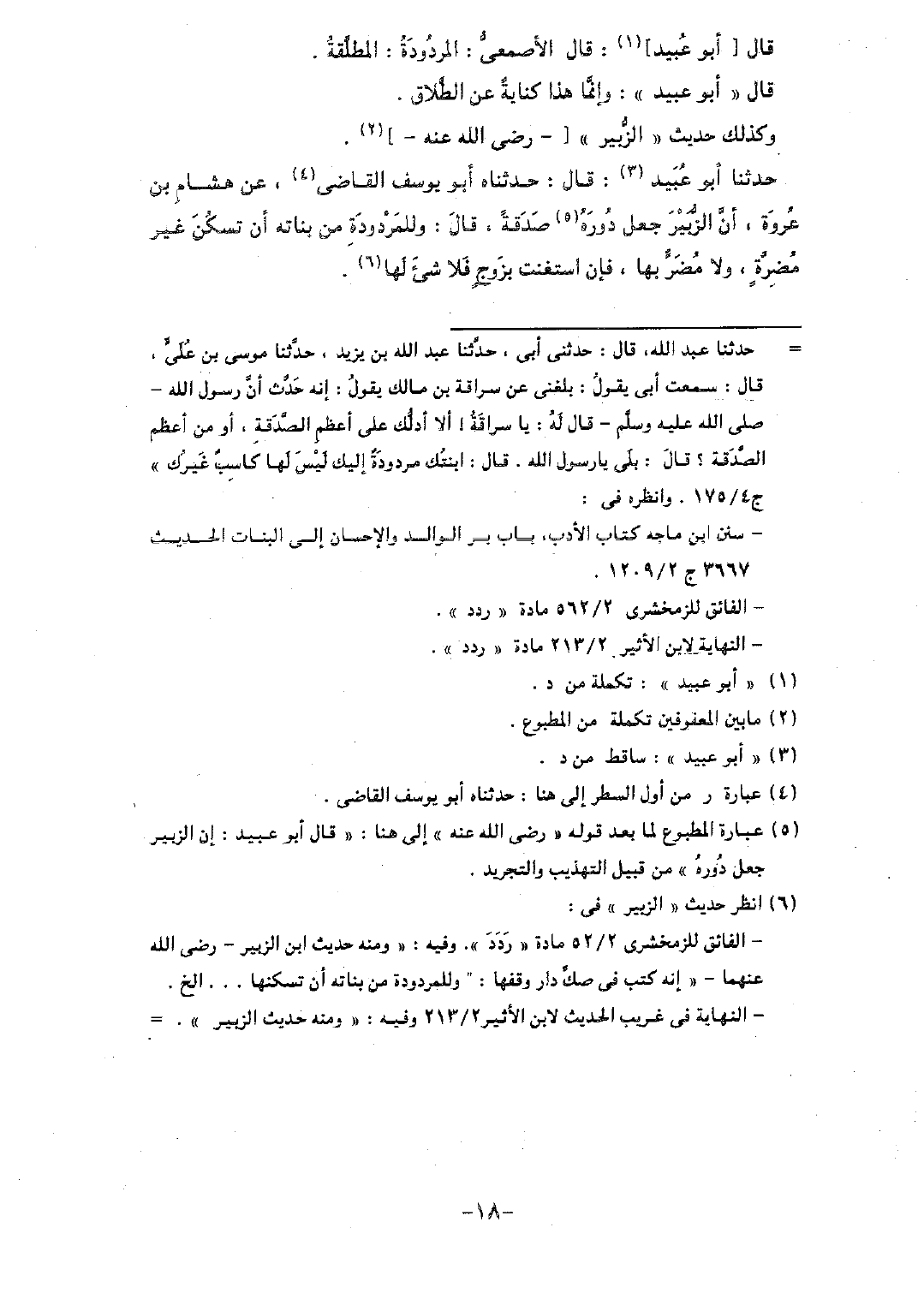 حدثنا أبو عبيد: قال: حدثناه أبو يوسف القاضي، عن هشام بن عروة، أن الزبير جعل دوره صدقةً، قال: وللمردودة من بناته أن تسكن غير مضرةٍ، ولا مضر بها، فإن استغنت بزوجٍ فلا شيء لها.