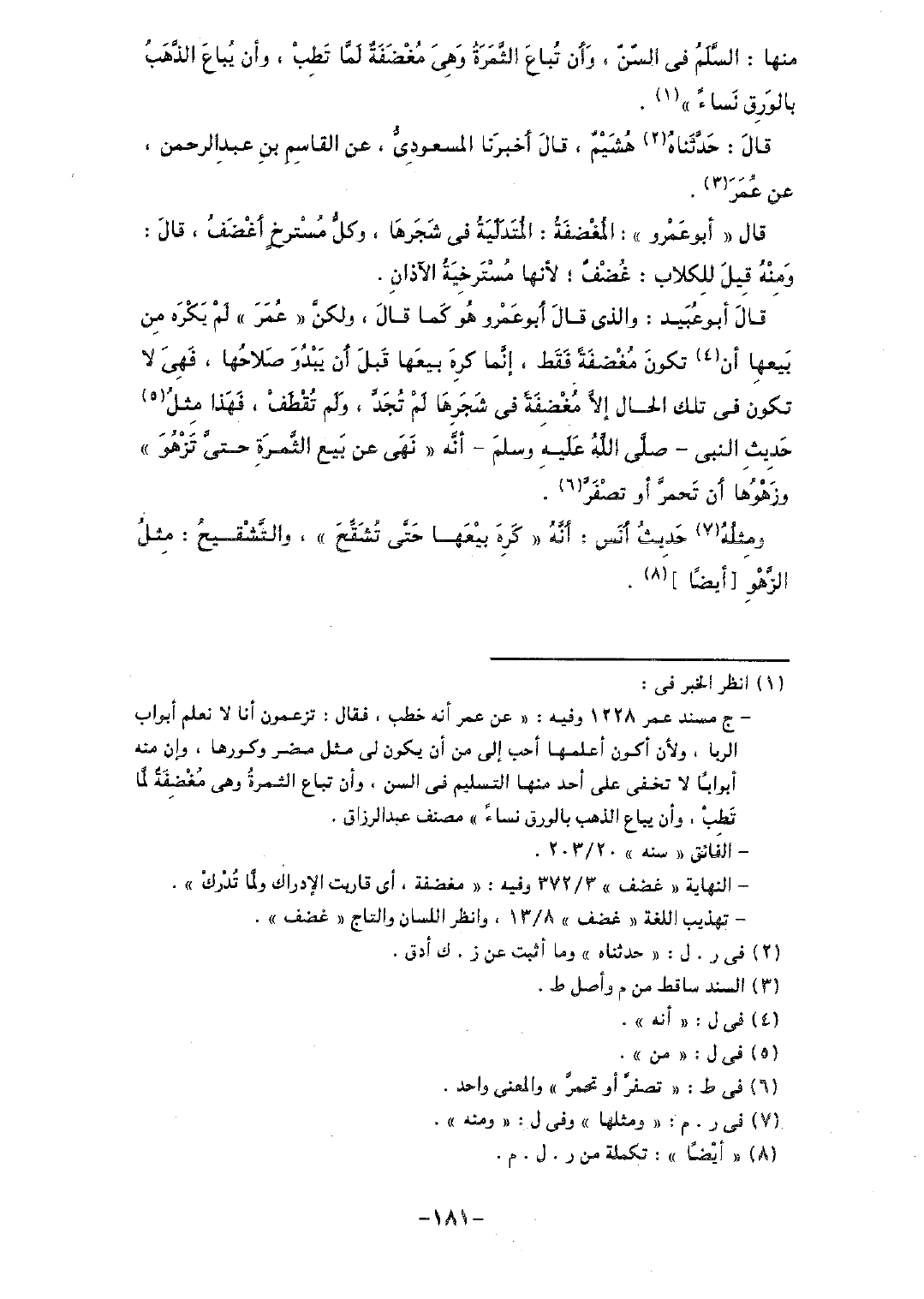 منها: السلمُ في السن، وأن تباع الثمرة وهي مغضفةٌ لما تطب، وأن يباع الذهب بالورق نساءً".