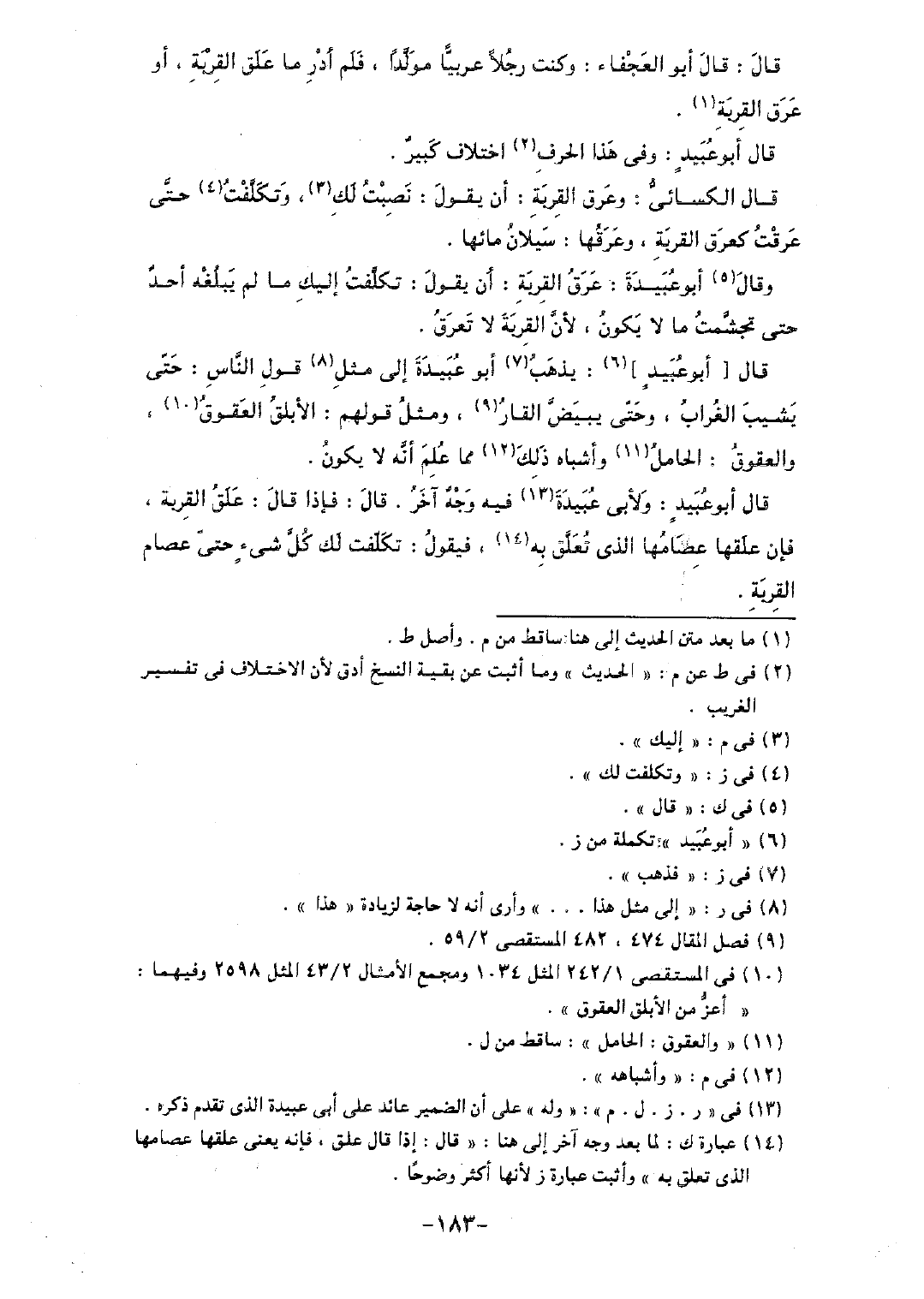 قال: قال أبو العجفاء: وكنت رجلاً عربياً مولداً، فلم أدر ما علق القربة، أو عرق القربة.