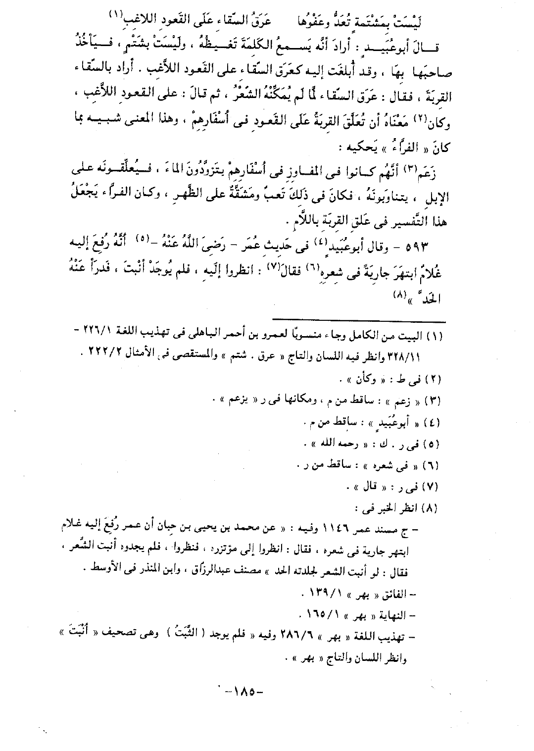 قال أبو عبيدٍ: أراد أنه يسمع الكلمة تغيظه، وليست بشتمٍ، فيأخذ صاحبها بها، وقد أبلغت إليه كعرق السقاء على القعود اللاغب. أراد بالسقاء القربة، فقال: عرق السقاء لما لم يُمكنه الشعر، ثم قال: على القعود اللاغب، وكان معناه أن تُعلق القربة على القعود في أسفارهم، وهذا المعنى شبيه بما كان "الفراء" يحكيه: