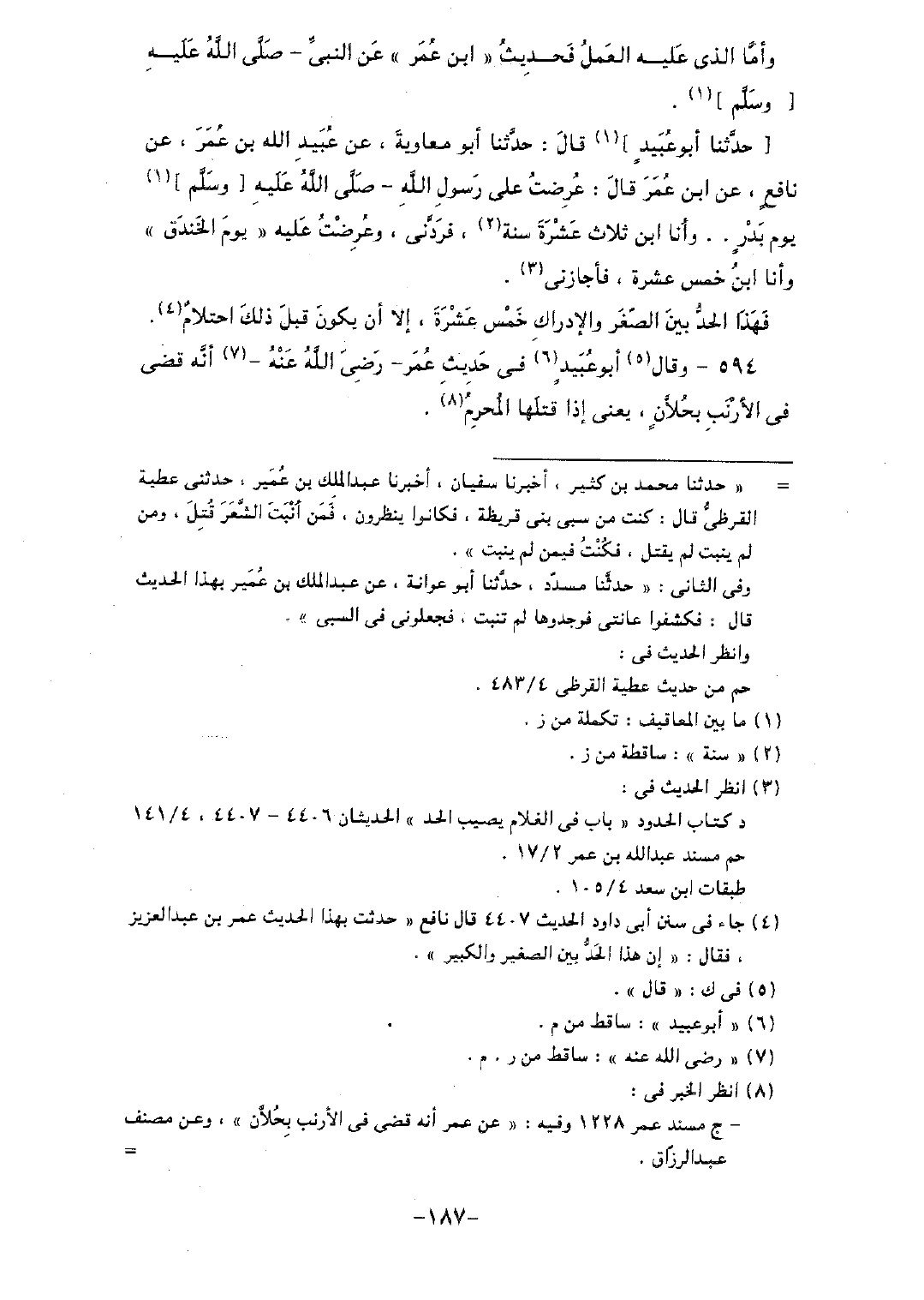 [حدثنا أبو عبيدٍ] قال: حدثنا أبو معاوية، عن عبيد الله بن عمر، عن نافعٍ، عن ابن عمر قال: عرضت على رسول الله - صلى الله عليه [وسلم] يوم بدرٍ .. وأنا ابن ثلاث عشرة سنة، فردني، وعُرضت عليه "يوم الخندق" وأنا ابن خمس عشرة، فأجازني.