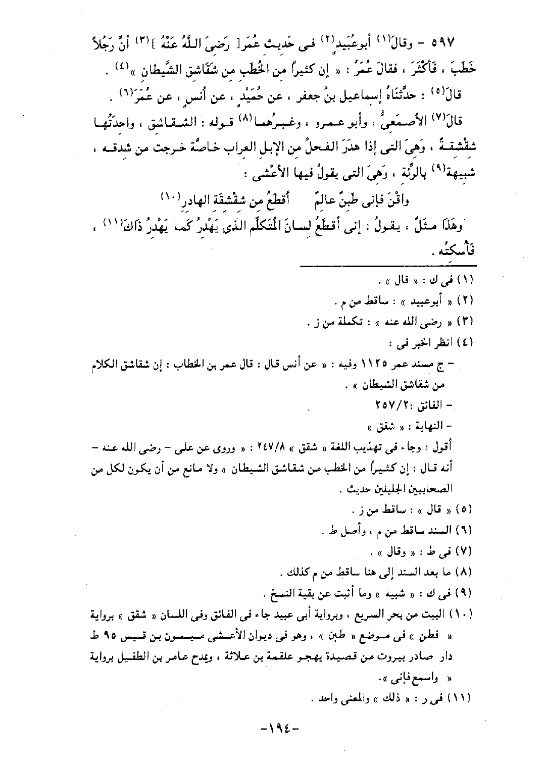 597 - وقال أبو عبيدٍ في حديث عمر [رضي الله عنه] أن رجلاً خطب، فأكثر، فقال عمر: "إن كثيراً من الخطب من شقاشق الشيطان".