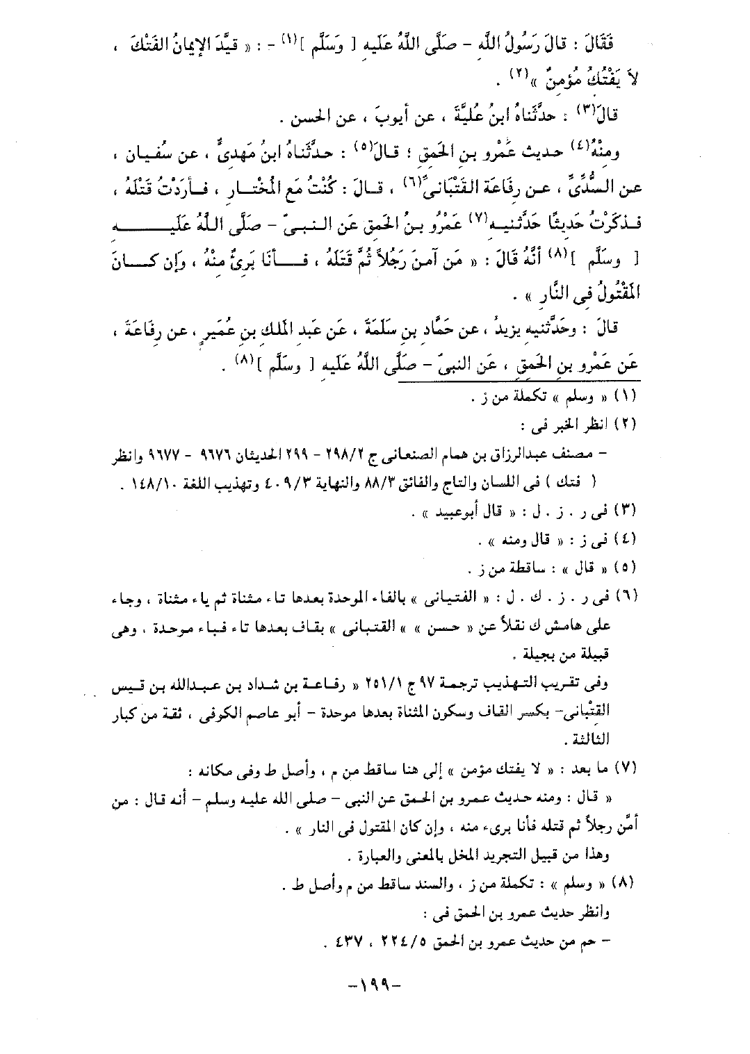 ومنه حديث عمرو بن الحمق؛ قال: حدثناه ابن مهدي، عن سفيان، عن السدي، عن رفاعة القتباني، قال: كنت مع المختار، فأردت قتله، فذكرت حديثاً حدثنيه عمرو بن الحمق عن النبي- صلى الله عليه [وسلم] أنه قال: "من آمن رجلاً ثم قتله، فأنا برئٌ منه، وإن كان المقتول في النار".