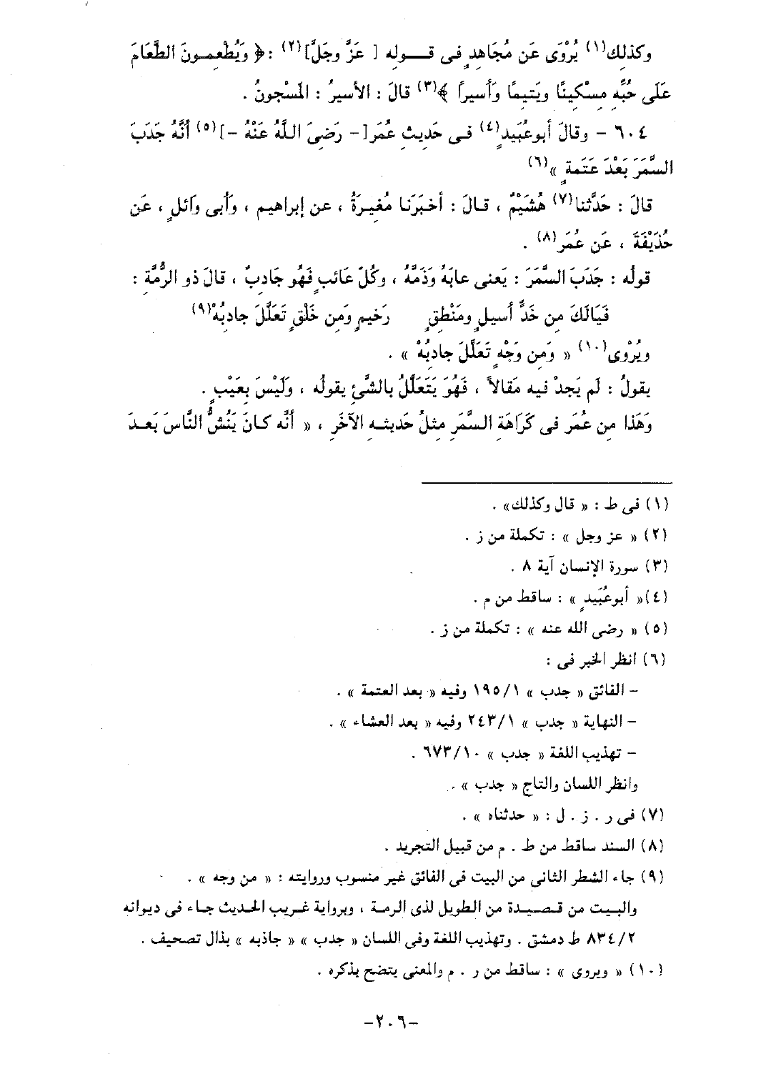 604 - وقال أبو عبيدٍ في حديث عمر [- رضي الله عنه-] أنه جدب السمر بعد عتمةٍ".