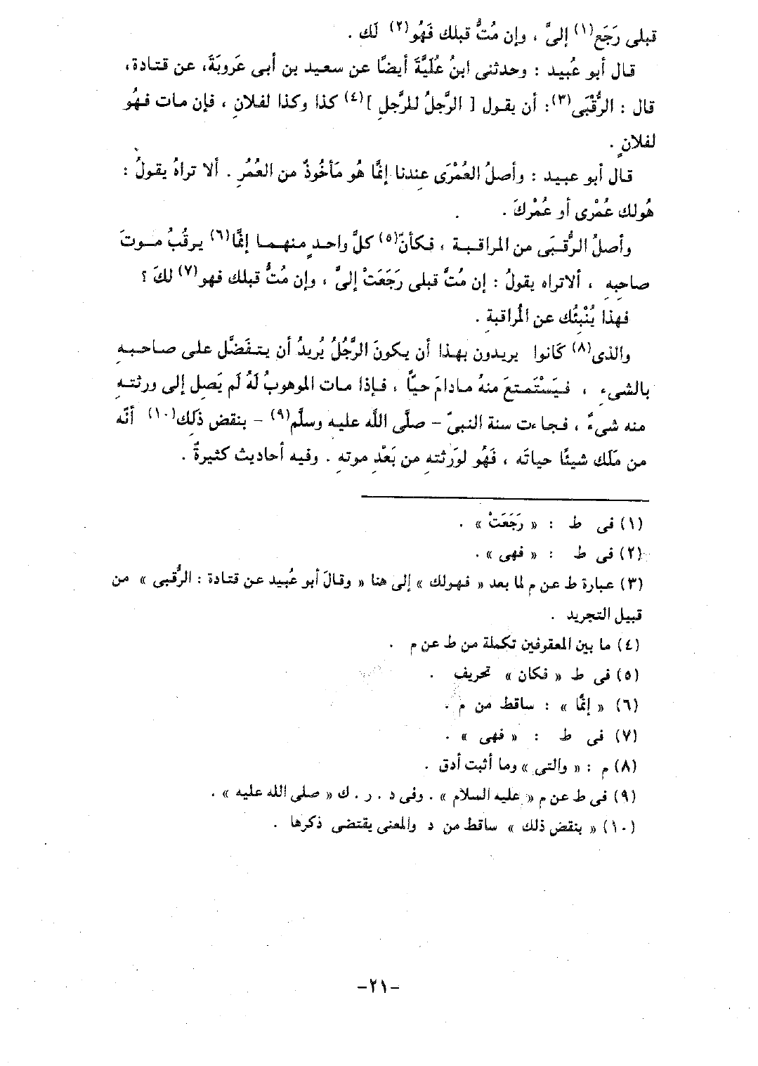 قال أبو عبيد: وحدثني ابن علية أيضاً عن سعيد بن أبي عروبة، عن قتادة، قال: الرقبى: أن يقول [الرجل للرجل] كذا وكذا لفلان، فإن مات فهو لفلانٍ.