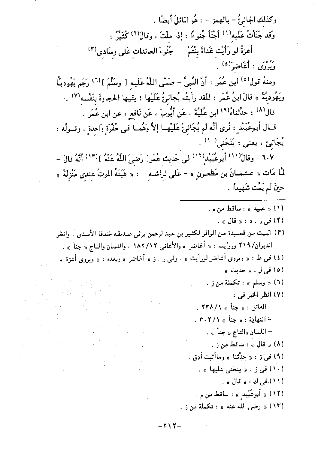 ومنه قول ابن عمر: أن النبي - صلى الله عليه [وسلم] رجم يهودياً ويهودية" قال ابن عمر: فلقد رأيته يجانئ عليها؛ يقيها الحجارة بنفسه.