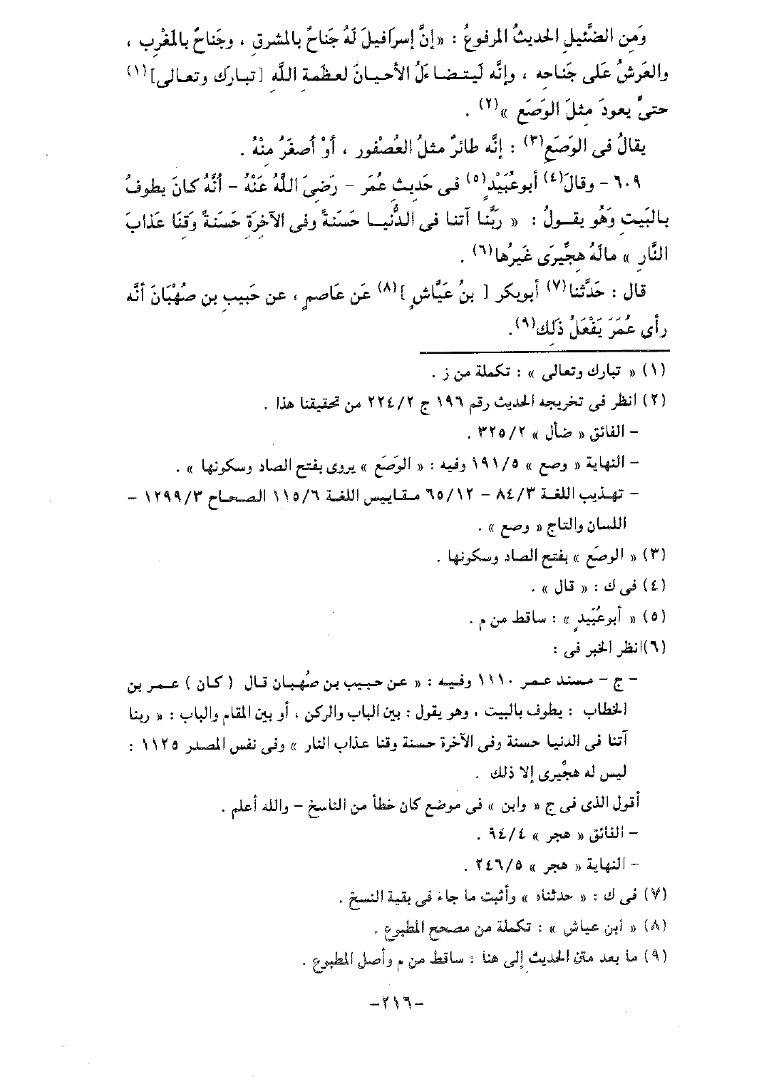 ومن الضئيل الحديث المرفوع: "إن إسرافيل له جناحٌ بالمشرق، وجناحٌ بالمغرب، والعرش على جناحه، وإنه ليتضاءل الأحيان لعظمة الله [تبارك وتعالى] حتى يعود مثل الوصع".