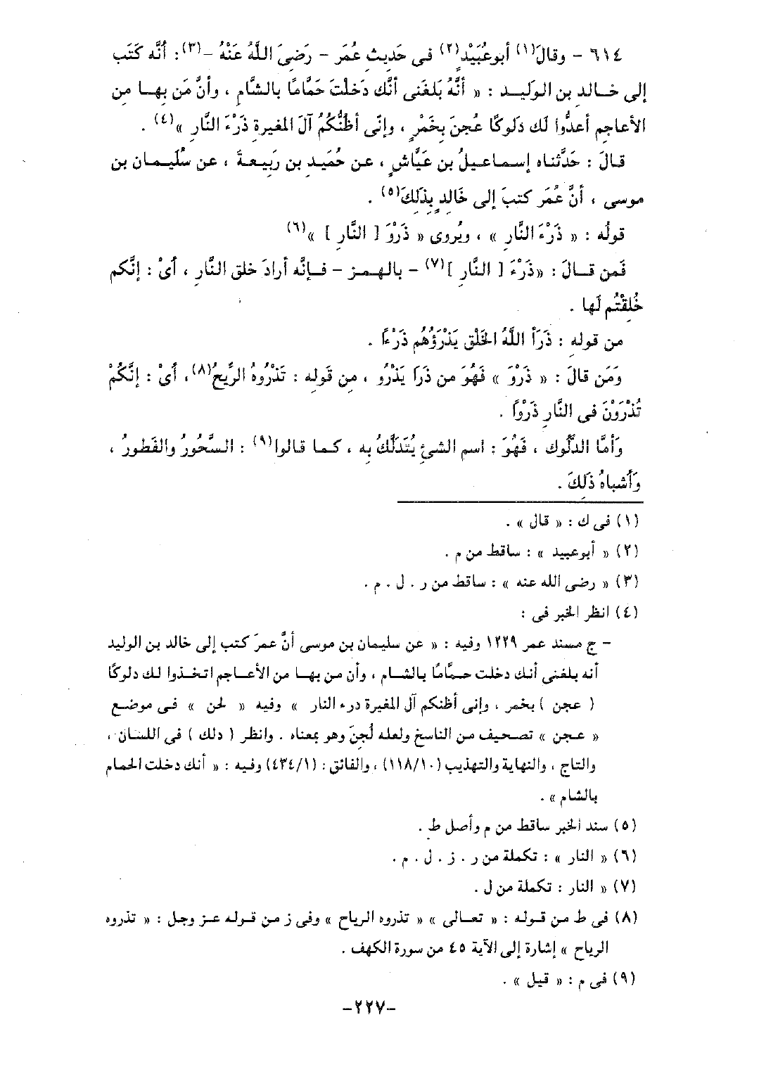 614 - وقال أبو عبيدٍ في حديث عمر - رضي الله عنه-: أنه كتب إلى خالد بن الوليد: "أنه بلغني أنك دخلت حماماً بالشام، وأن من بها من الأعاجم أعدوا لك دلوكاً عجن بخمرٍ، وإني أظنكم آل المغيرة ذرء النار".