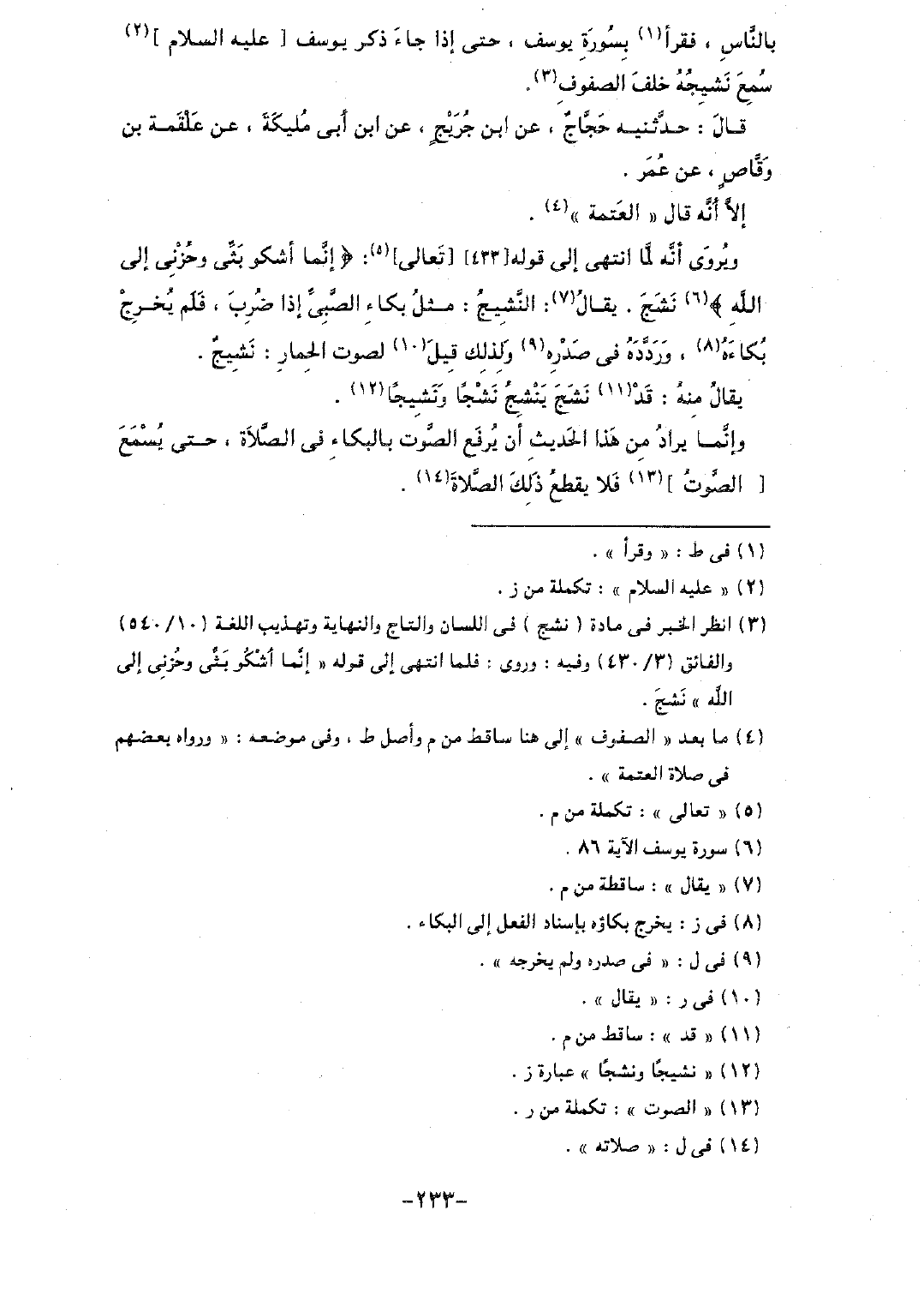 ويروى أنه لما انتهى إلى قوله [433] [تعالى]: (إنما أشكو بثي وحزني إلى الله) نشج. يقال: النشيجُ: مثل بكاء الصبي إذا ضُرب، فلم يخرج بكاءه، وردده في صدره ولذلك قيل لصوت الحمار: نشيجٌ.