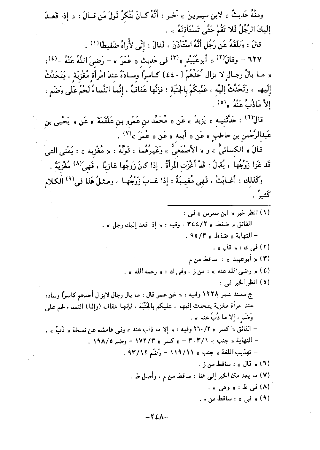 627 - وقال "أبو عبيدٍ" في حديث "عمر"- رضي الله عنه-: "ما بال رجالٍ لا يزال أحدهم [440] كاسراً وساده عند امرأةٍ مغزيةٍ، يتحدث إليها، وتحدث إليه، عليكم بالجنبة؛ فإنها عفافٌ، إنما النساء لحم على وضمٍ، إلا ما ذُب عنه".