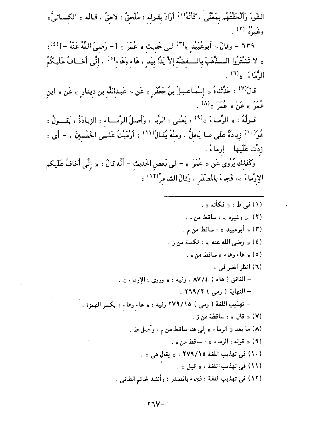 639 - وقال "أبو عبيدٍ" في حديث "عمر" [- رضي الله عنه-]: "لا تشتروا الذهب بالفضة إلا يداً بيدٍ، هاء وهاء، إني أخاف عليكم الرماء".