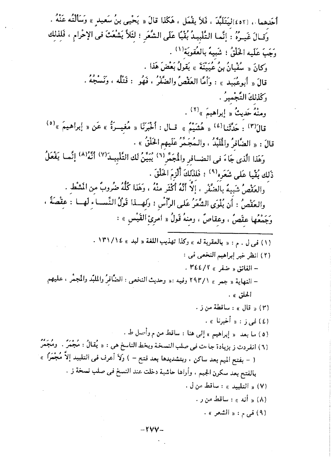 وهذا الذي جاء في الضافر والمجمر يبين لك التلبيد أنه إنما يفعل ذلك بقيا على شعره؛ فلذلك ألزم الحلق.