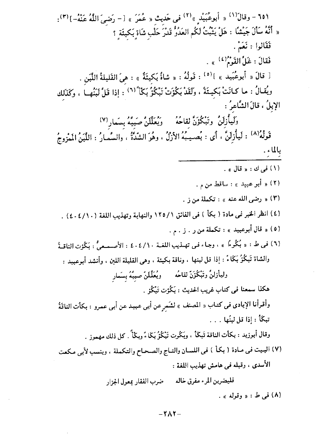 651 - وقال "أبو عبيدٍ" في حديث "عمر" [رضي الله عنه] "أنه سأل جيشًا: هل يثبت لكم العدو قدر حلب شاةٍ بكيئةٍ؟