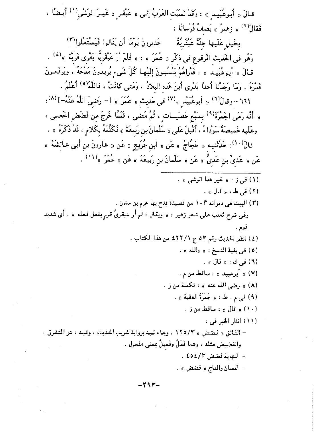 661 - وقال "أبو عبيدٍ" في حديث "عمر" [رضي الله عنه]: "أنه رمى الجمرة بسبع حصياتٍ، ثم مضى، فلما خرج خرج من فضض الحصى، وعليه خميصة سوداء، أقبل على "سلمان بن ربيعة" فكلمه بكلامٍ، قد ذكره".