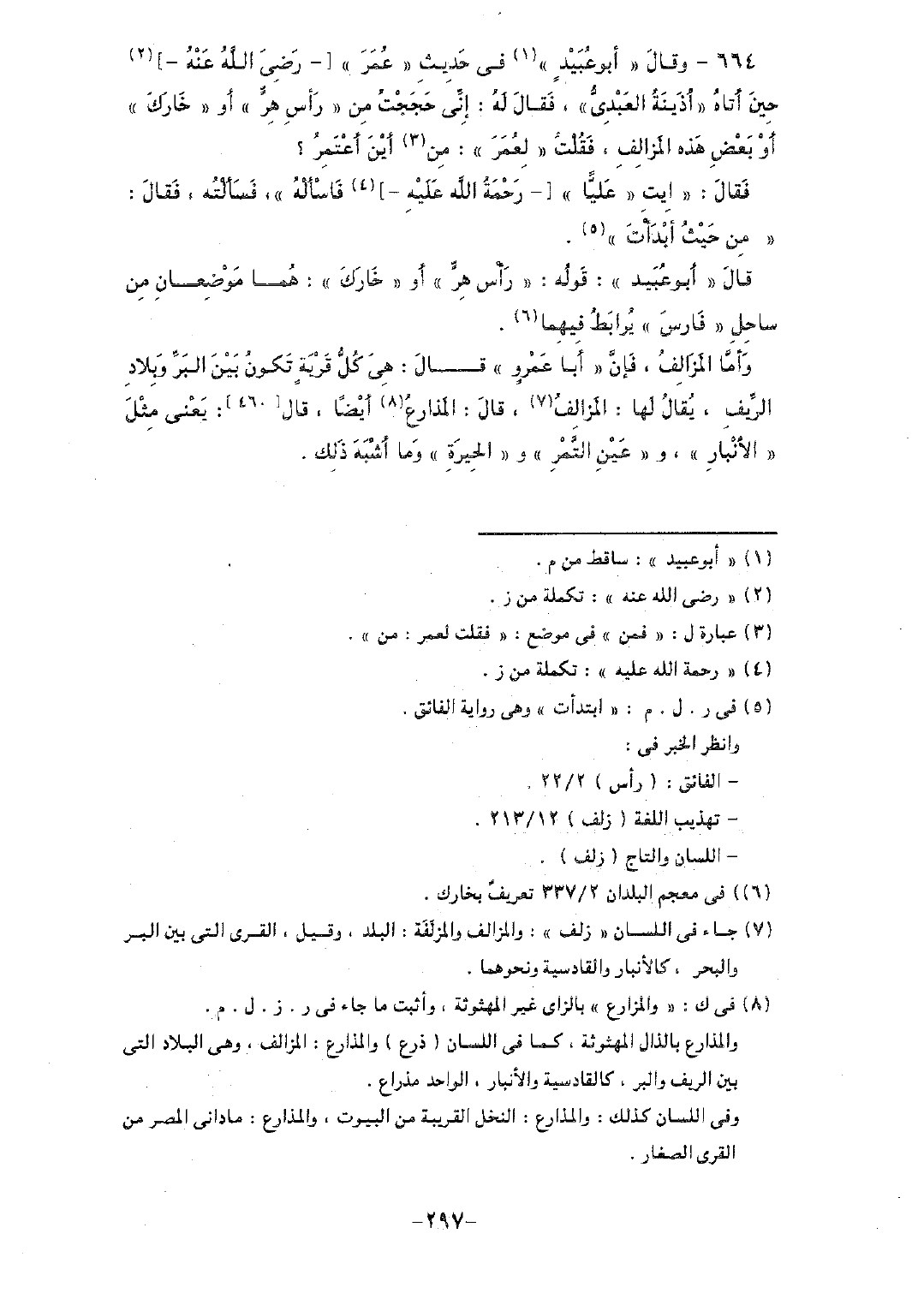 664 - وقال "أبو عبيدٍ" في حديث "عمر" [رضي الله عنه] حين أتاه "أذينة العبدي"، فقال له: إني حججت من "رأس هر" أو "خارك" أو بعض هذه المزالف، فقلت "لعمر": من أين اعتمر؟