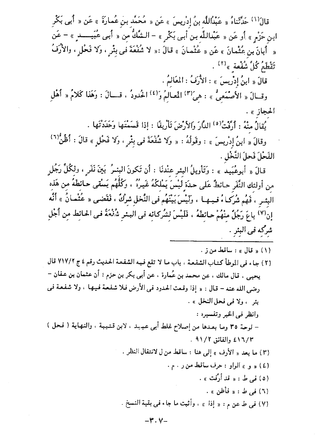 قال حدثناه "عبد الله بن إدريس" عن "محمد بن عمارة" عن "أبي بكر ابن حزمٍ" أو عن "عبد الله بن أبي بكرٍ" -الشك من "أبي عبيدٍ"- عن "أبان بن عثمان" عن "عثمان" قال: "لا شفعة في بئرٍ، ولا فحلٍ، والأرف تقطع كل شفعةٍ".