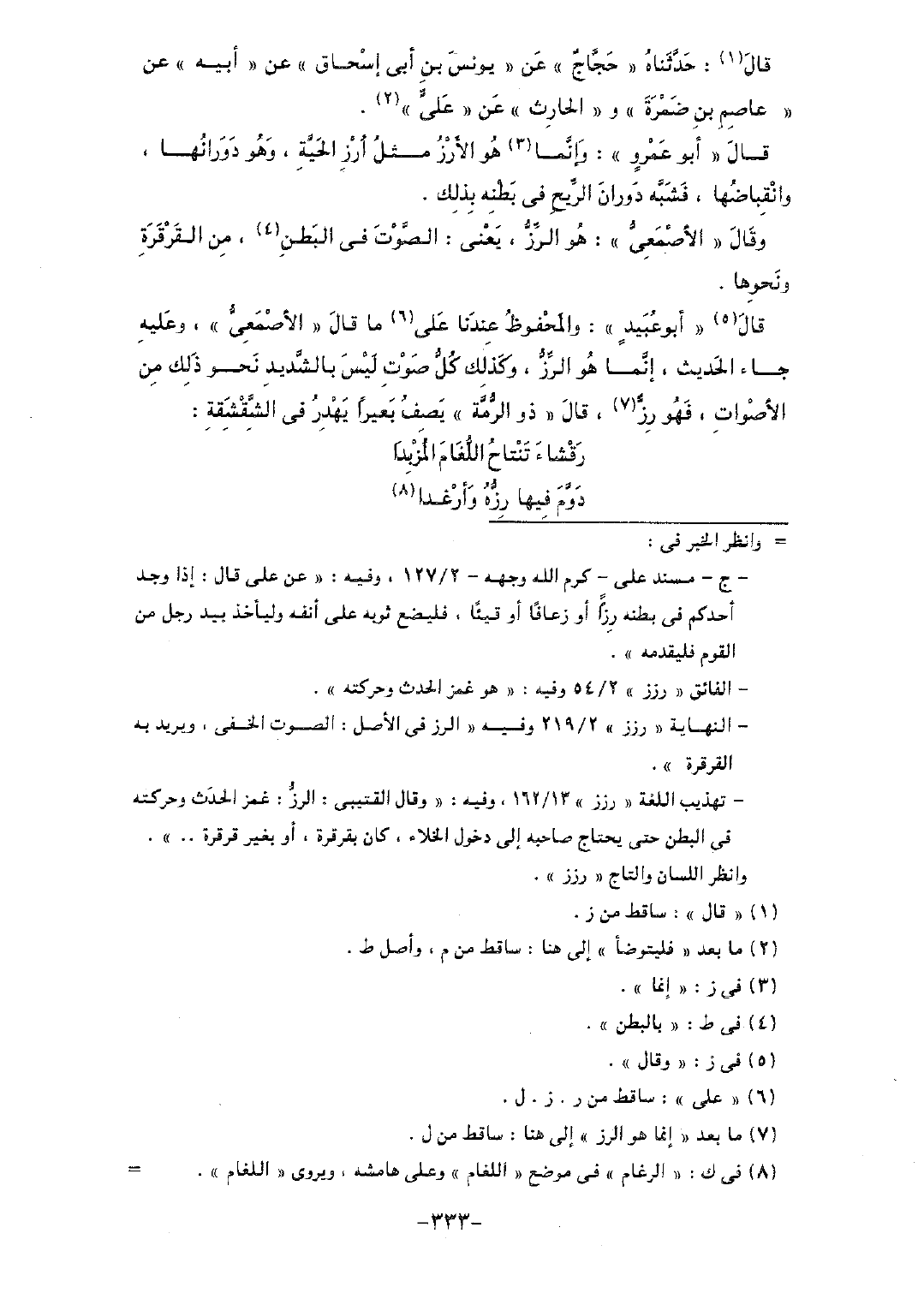 قال "أبو عبيدٍ": والمحفوظ عندنا على ما قال "الأصمعي"، وعليه جاء الحديث، إنما هو الرز، وكذلك كل صوت ليس بالشديد نحو ذلك من الأصوات، فهو رز، قال "ذو الرمة" يصف بعيرًا يهدر في الشقشقة: