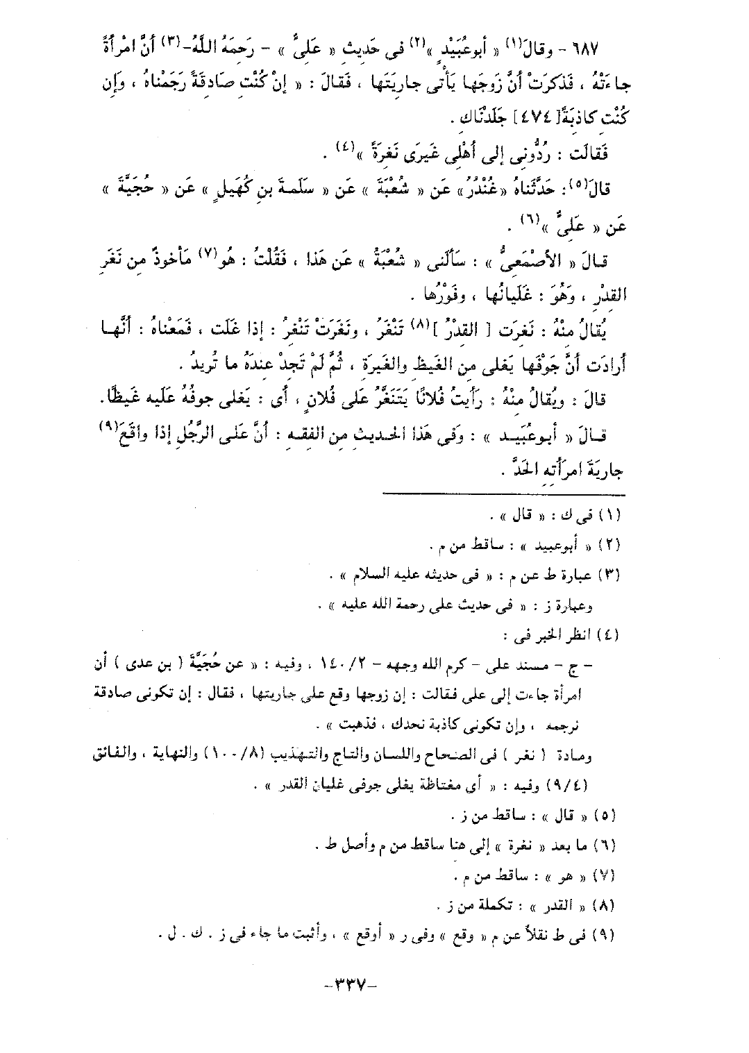 687 - وقال "أبو عبيدٍ" في حديث "علي" -رحمه الله- أن امرأة جاءته، فذكرت أن زوجها يأتي جاريتها، فقال: "إن كنت صادقة رجمناه، وإن كنت كاذبة جلدناك".